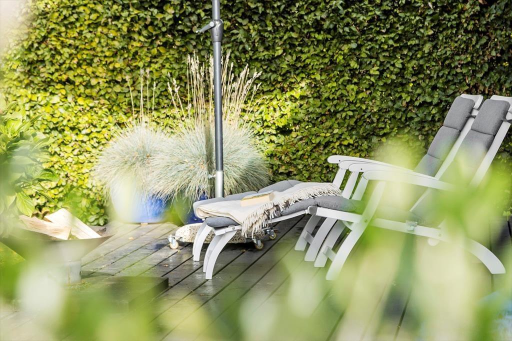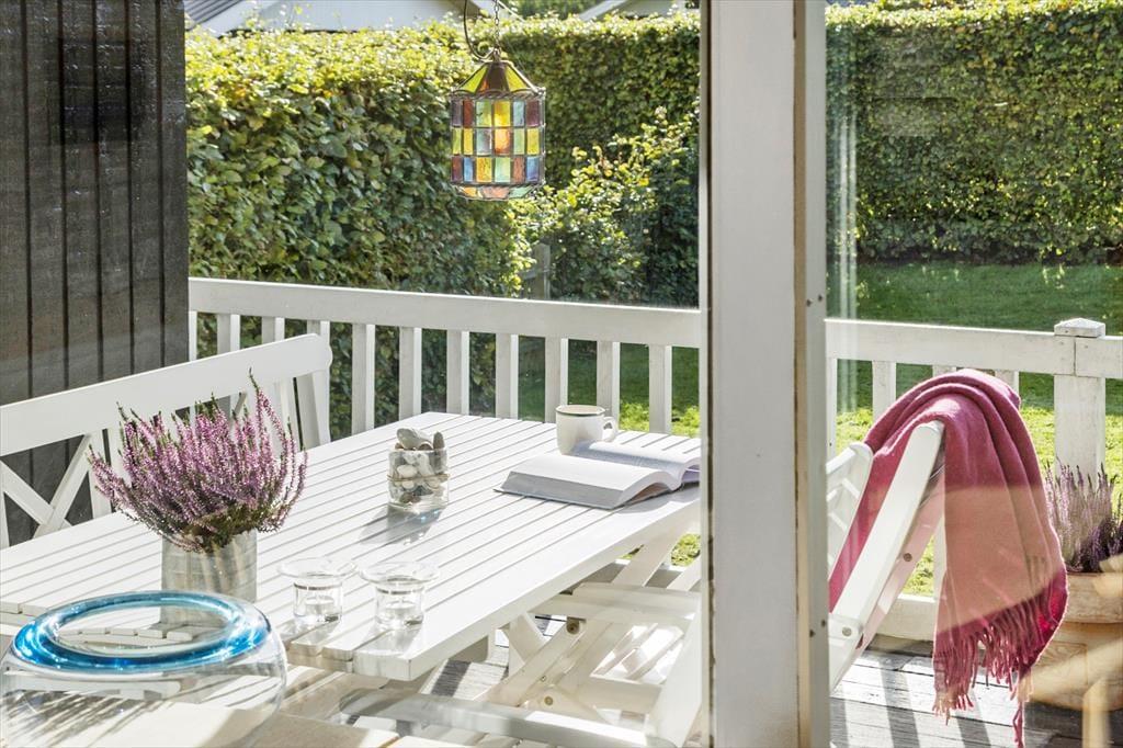 Fra husets alrum er der direkte adgang til terrassen. Sæt jer i de fine hvide havemøbler og oplev glæden ved at komme helt ned i gear. Udnyt de dejlige danske sommerhusaftner og tænd op i huset gode gasgrill.