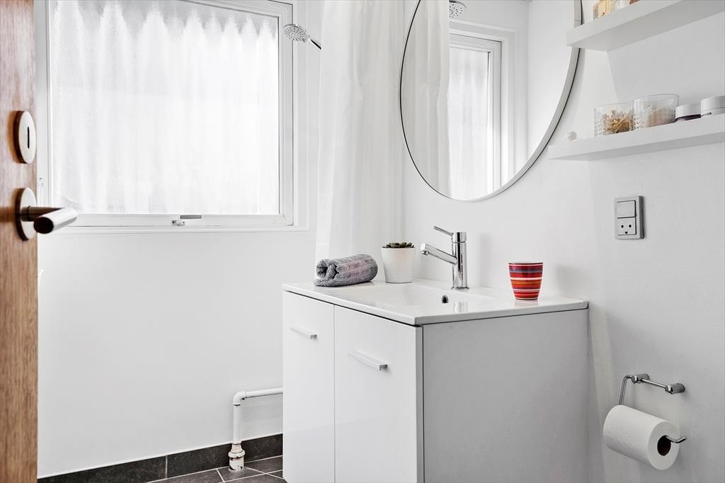 Huset badeværelse er ligesom resten af huset renoveret i 2020. Badeværelset fremstår lyst og lækkert i den gennemgående gode nordiske sommerhusstil. Her er der varme i gulvet og et skønt lysindfald.