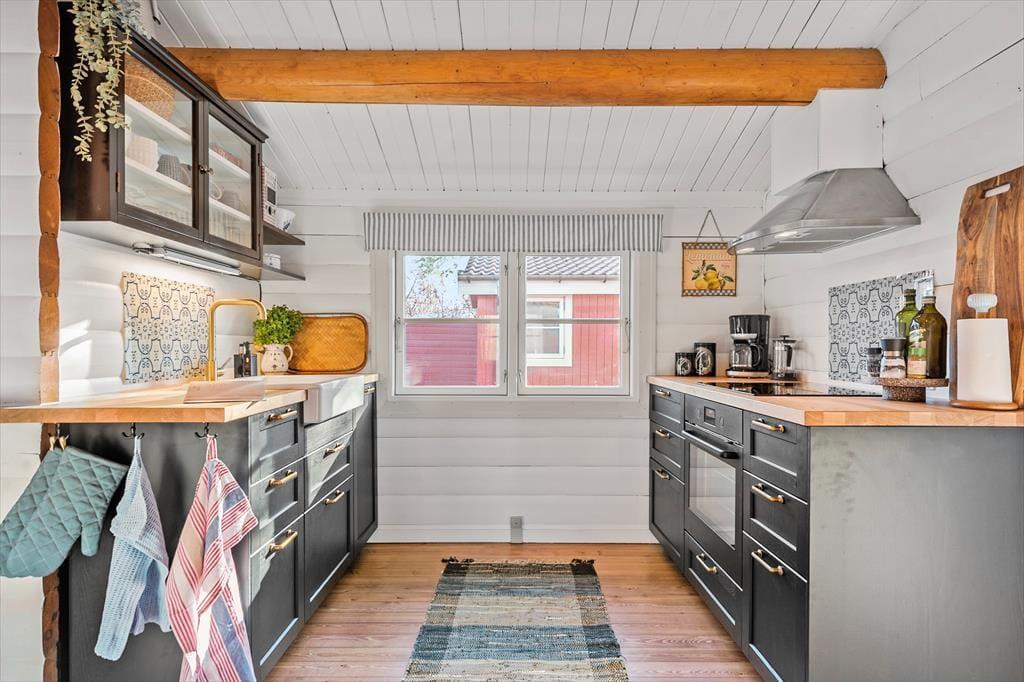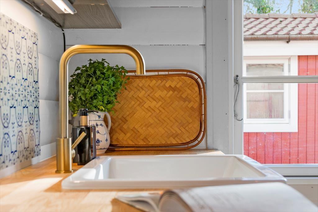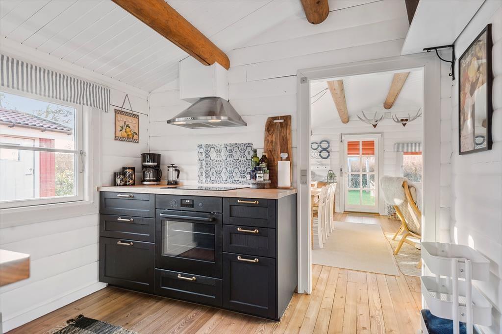 Fra stuen er der adgang til køkkenet, der er et fint, mindre sommerhuskøkken, der har alt det, man skal bruge, når feriens måltider skal tilberedes. Her er blandt andet opvaskemaskine, ovn og komfur samt kaffemaskine. Der er også et vindue, der giver lys ind i køkkenet og udsyn til haven.