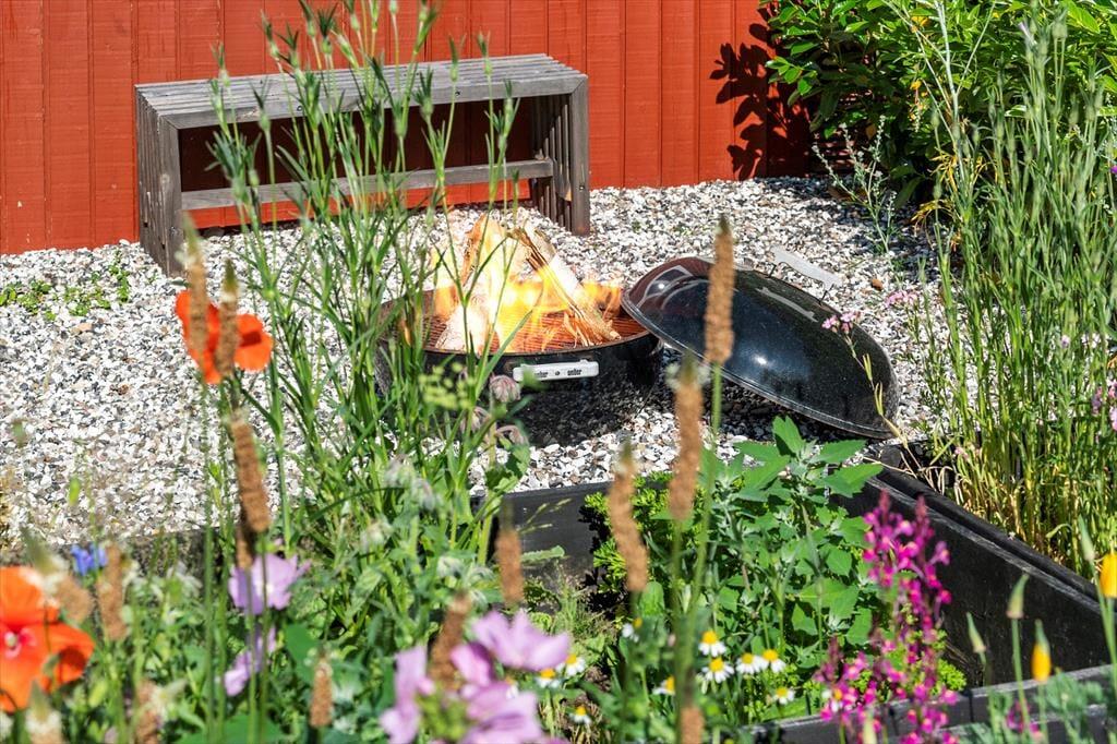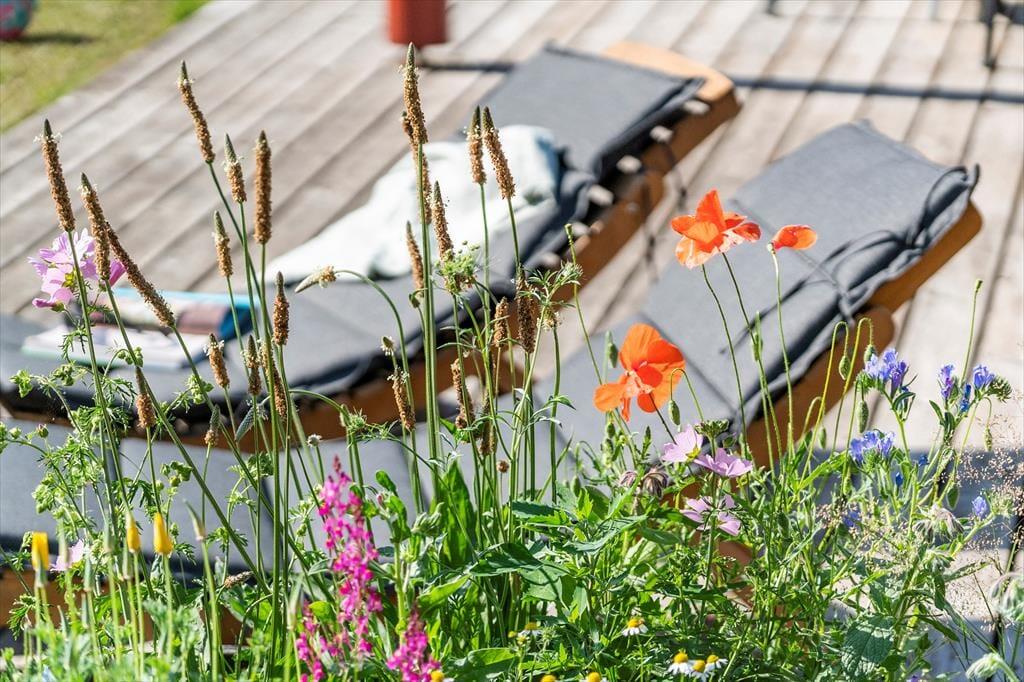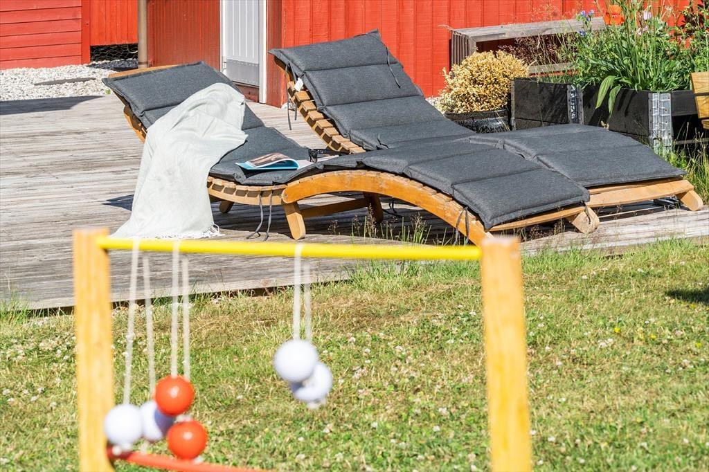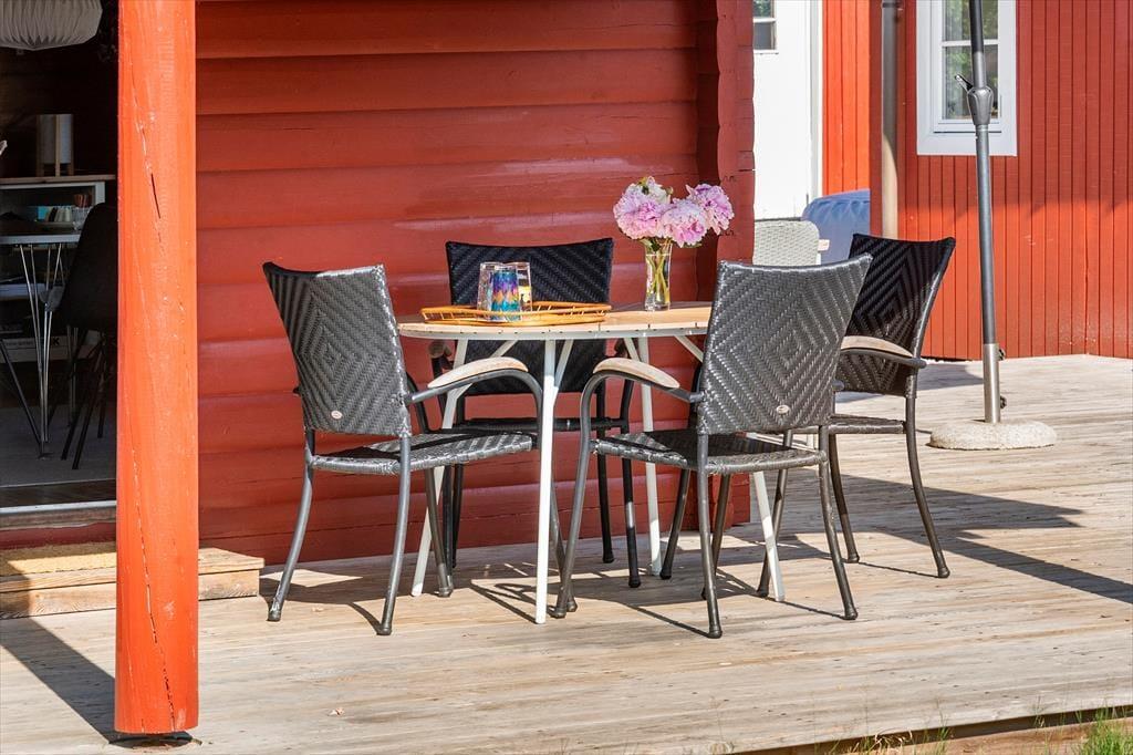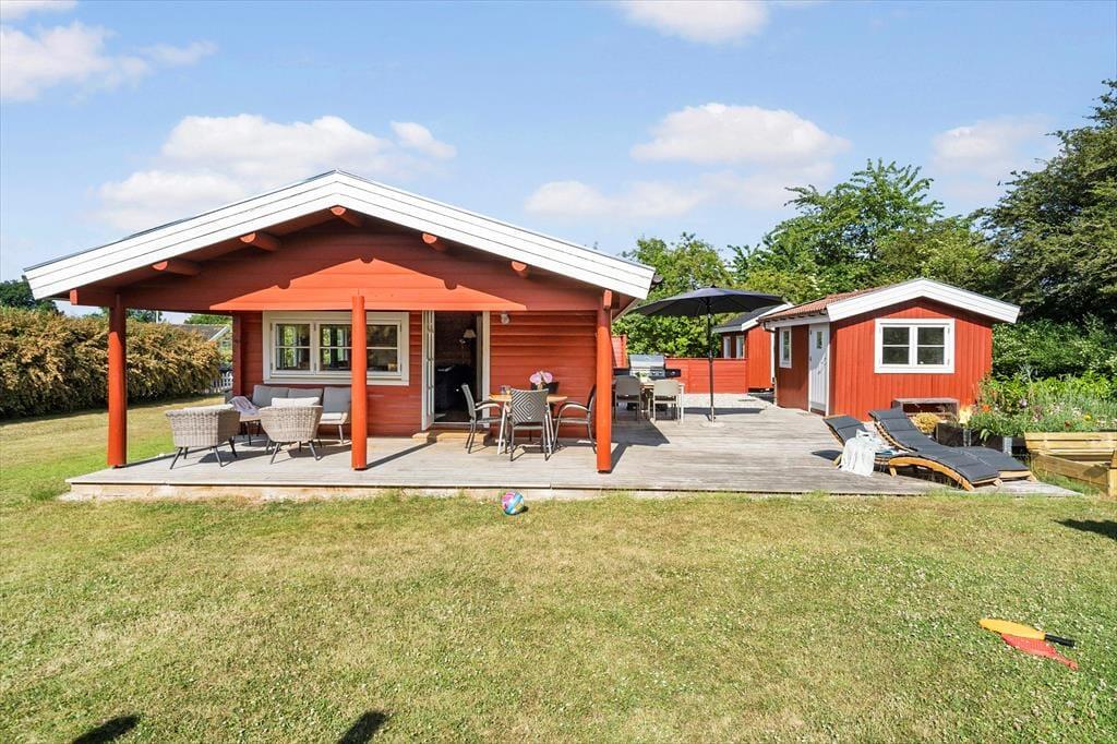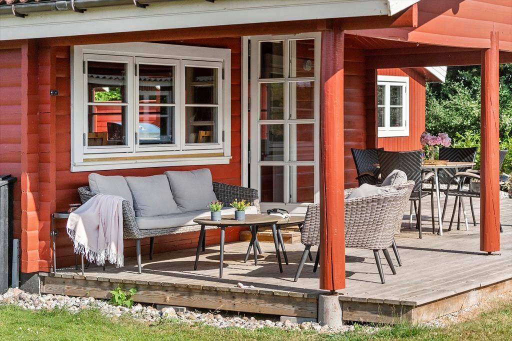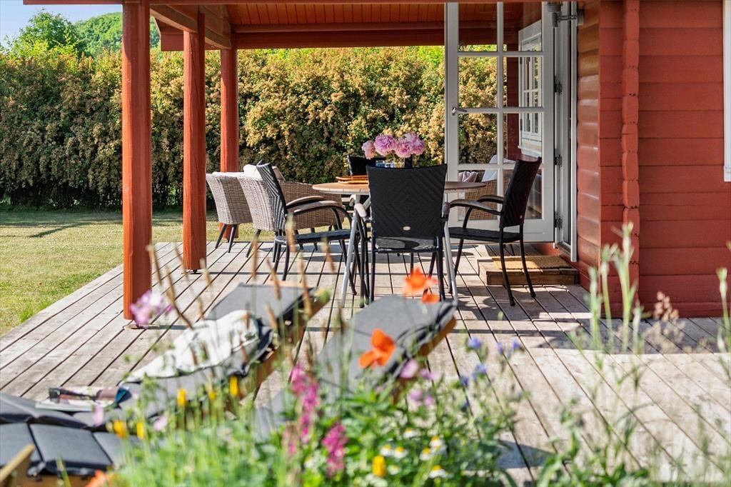 Sommerhuset har en stor træterrasse, der er direkte udgang til fra stuen. Fra stuen træder man ud på den overdækkede terrasse, hvor der er komfortable og bløde havemøbler, så her kan man virkelig nyde sommerhusets terrasse og have. Her er også bord og stole, hvor det er perfekt at tage sine måltider med udenfor, så snart vejret tillader det. Terrassen fortsætter om på husets sydside, hvor der er en lille aflukket gårdhave med læ og en god grill. Træterrassen forbinder også sommerhuset med annekset, hvor der er to ekstra senge og gode sovepladser.