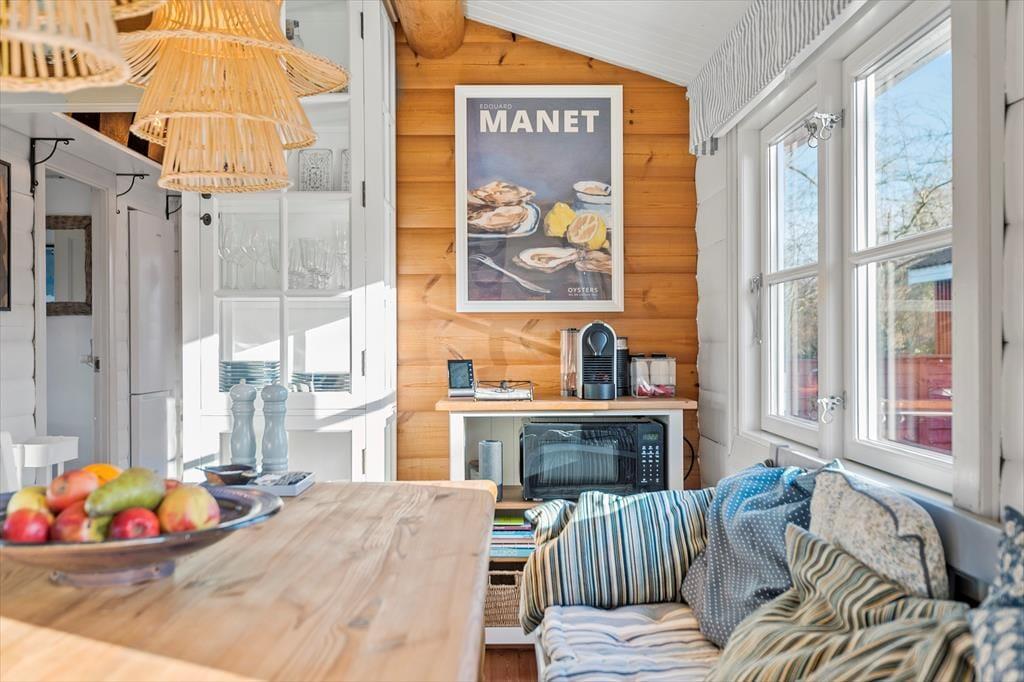 Sommerhuset er et gennemført træhus, der giver en hyggelig stemning, og samtidig er huset lyst og indbydende. Stuen er husets samlingsrum, da her er et spisebord med plads til alle husets gæster samt en sofa og lænestole, hvor man kan slappe helt af med et brætspil eller tænde for TV´et.