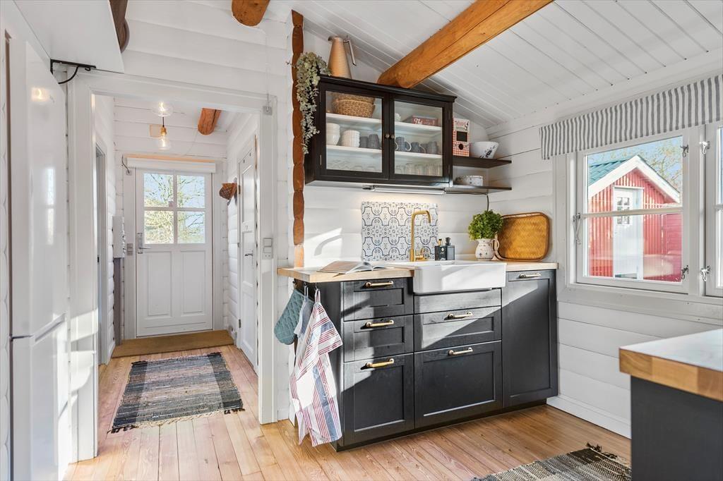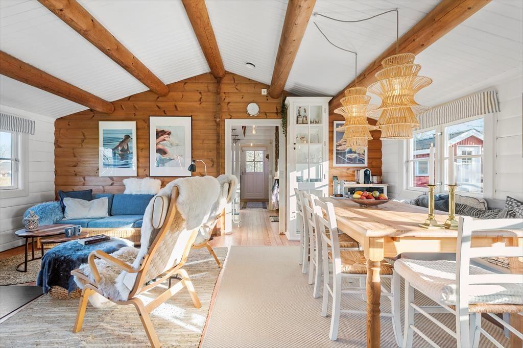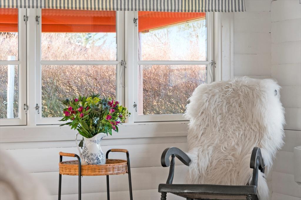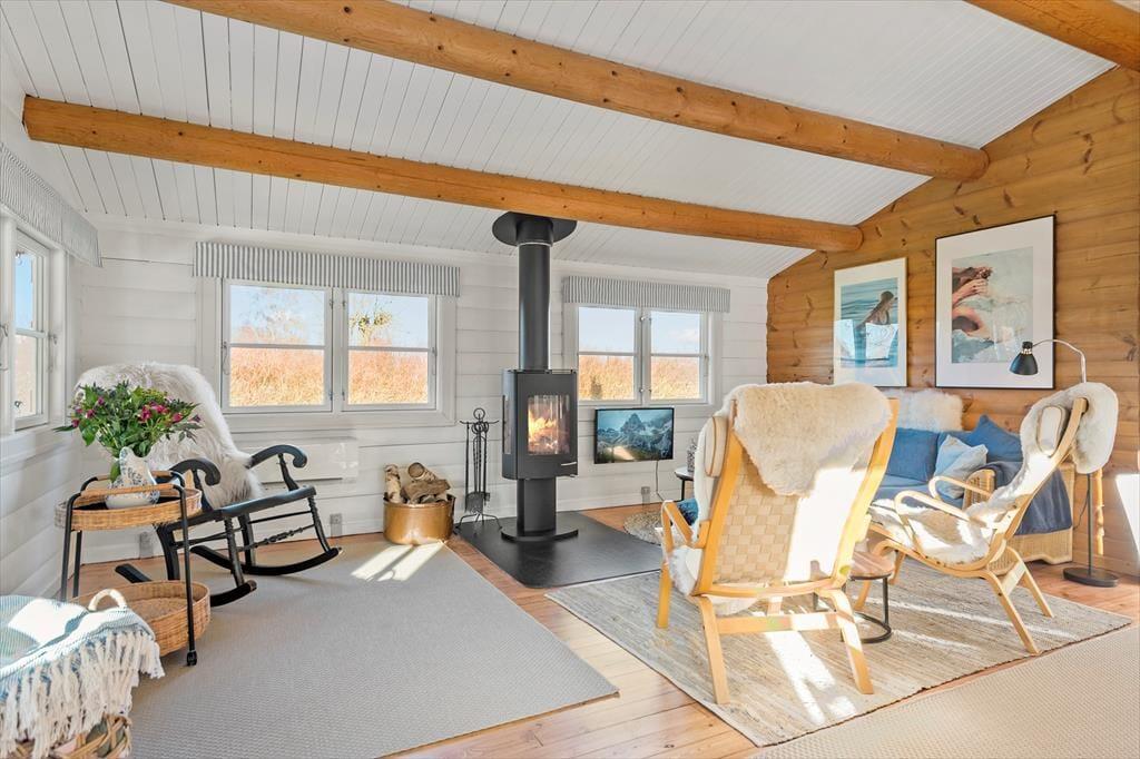 Gennemgående i huset er hvide dørkarme, vinduer og skabe, hvilket giver en lys og moderne fornemmelse i det hyggelige bjælkehus.