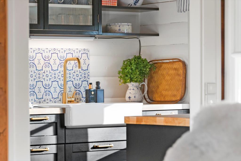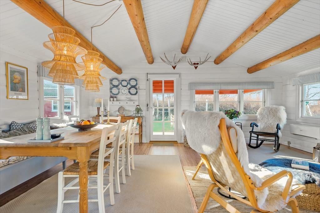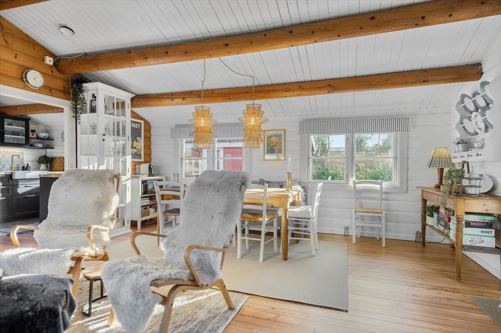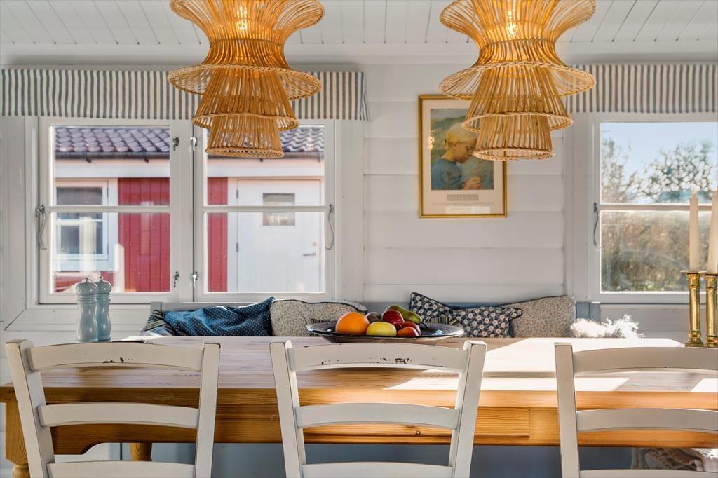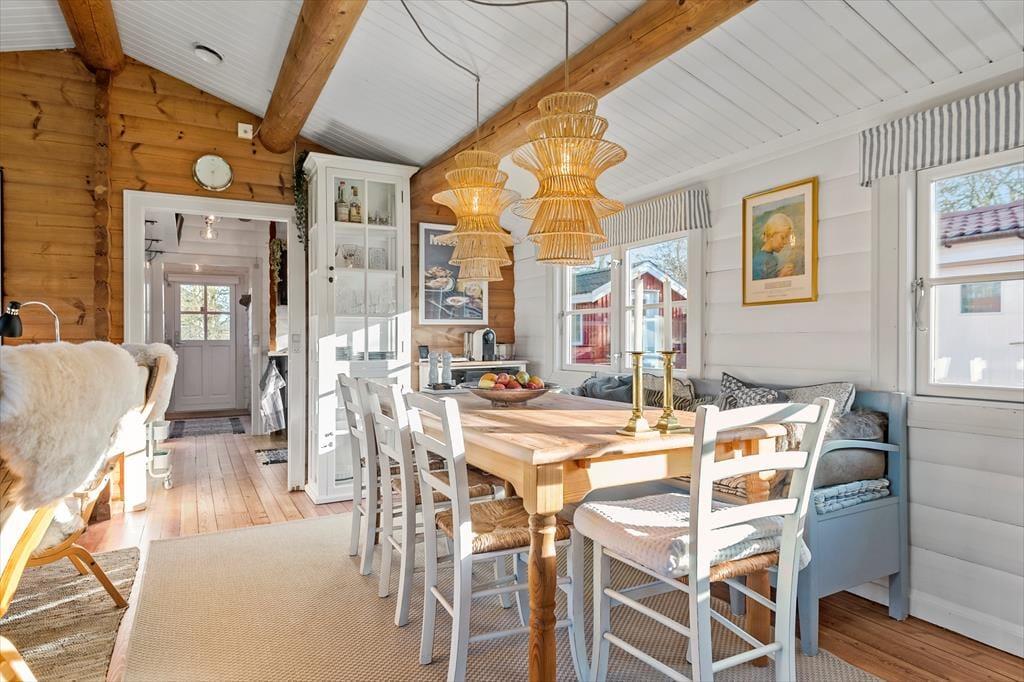 Gennemgående i huset er hvide dørkarme, vinduer og skabe, hvilket giver en lys og moderne fornemmelse i det hyggelige bjælkehus.