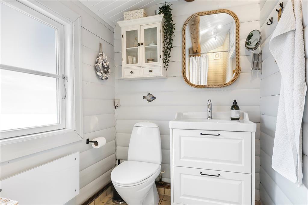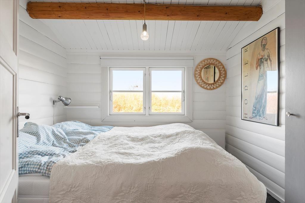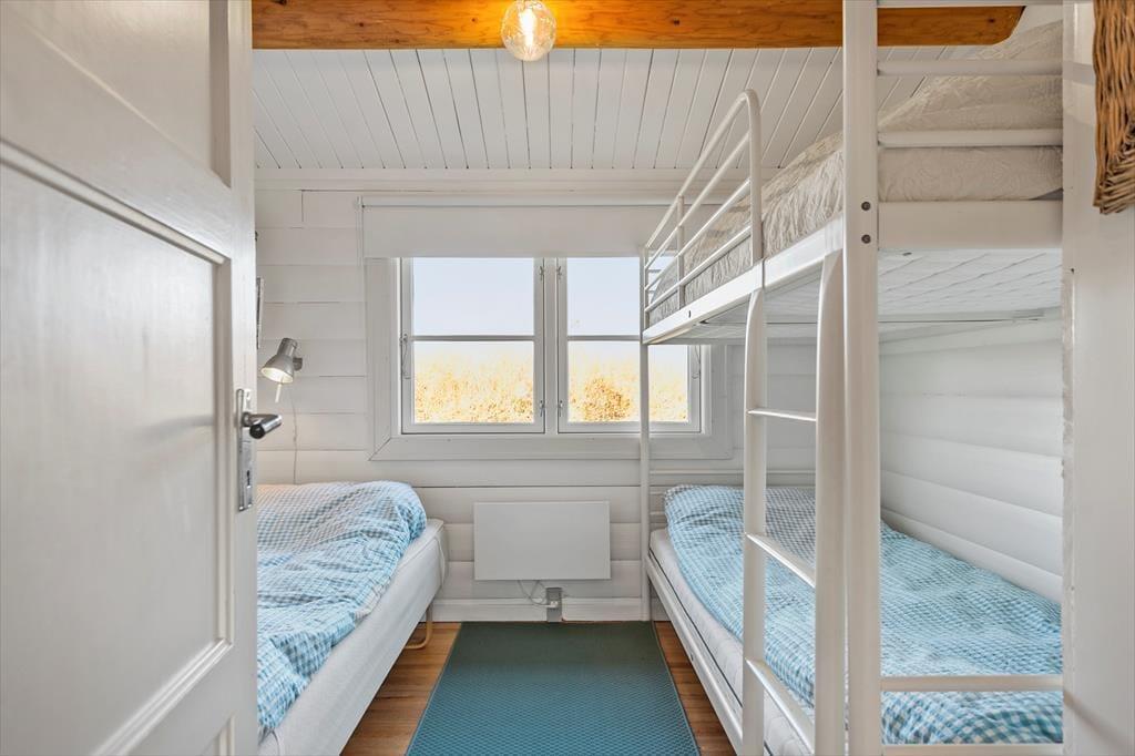 I det ene soveværelse er der en seng og en køjeseng, så her kan i alt sove 3 personer. Her er også et skab og et godt vindue, så der kommer lys ind på det lille hyggelige værelse. Ved siden af er det andet soveværelse med en dobbeltseng og mere skabsplads. Overfor soveværelserne er husets toilet og bad, hvor trævæggene fortsætter, men her er flisegulv med gulvvarme. Badeværelset er et funktionelt og pænt sommerhustoilet.