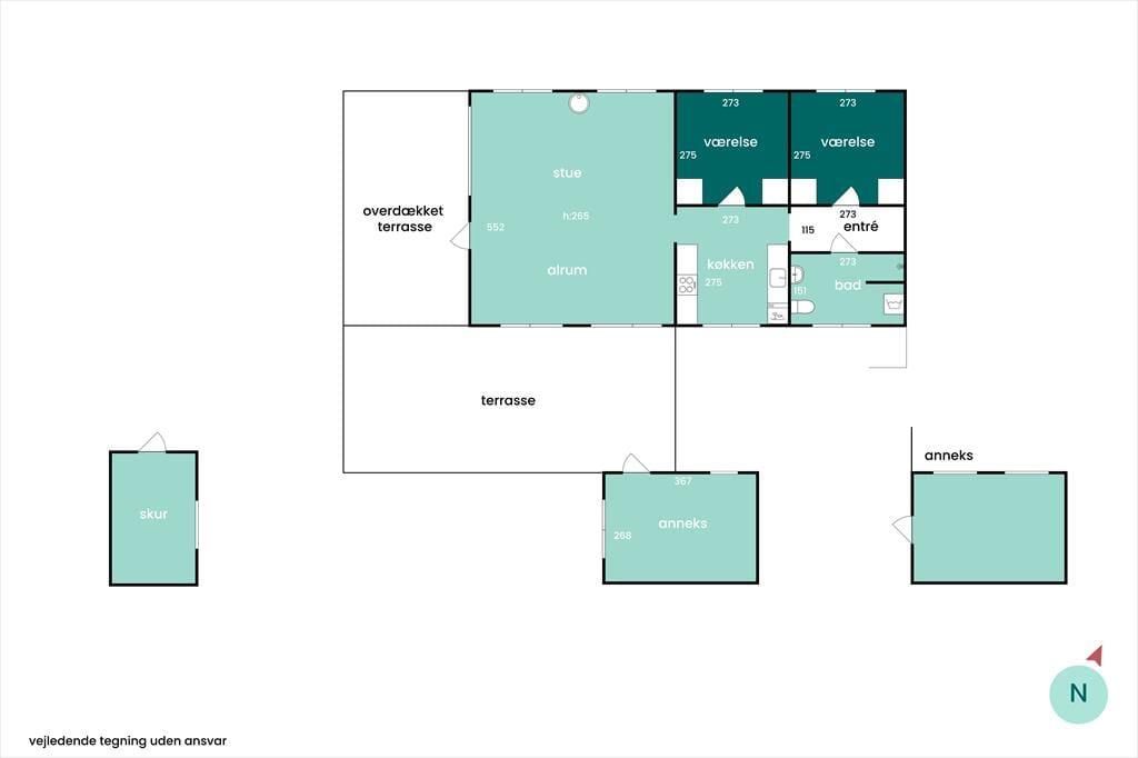 Udenfor er et nyrenoveret anneks med to ekstra sengepladser. Annekset er forbundet med sommerhuset via terrassen, og her er to gode senge i det lyse anneks, der også kan opvarmes af en el-radiator.
