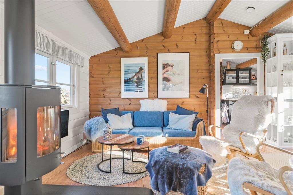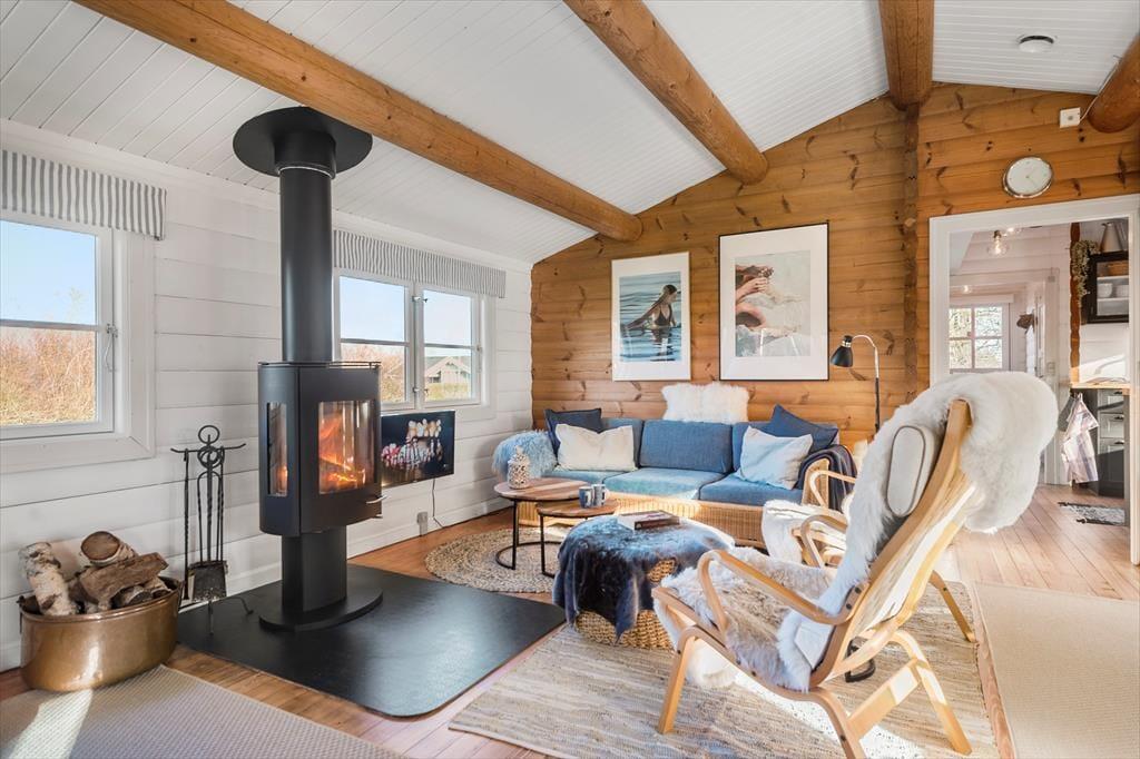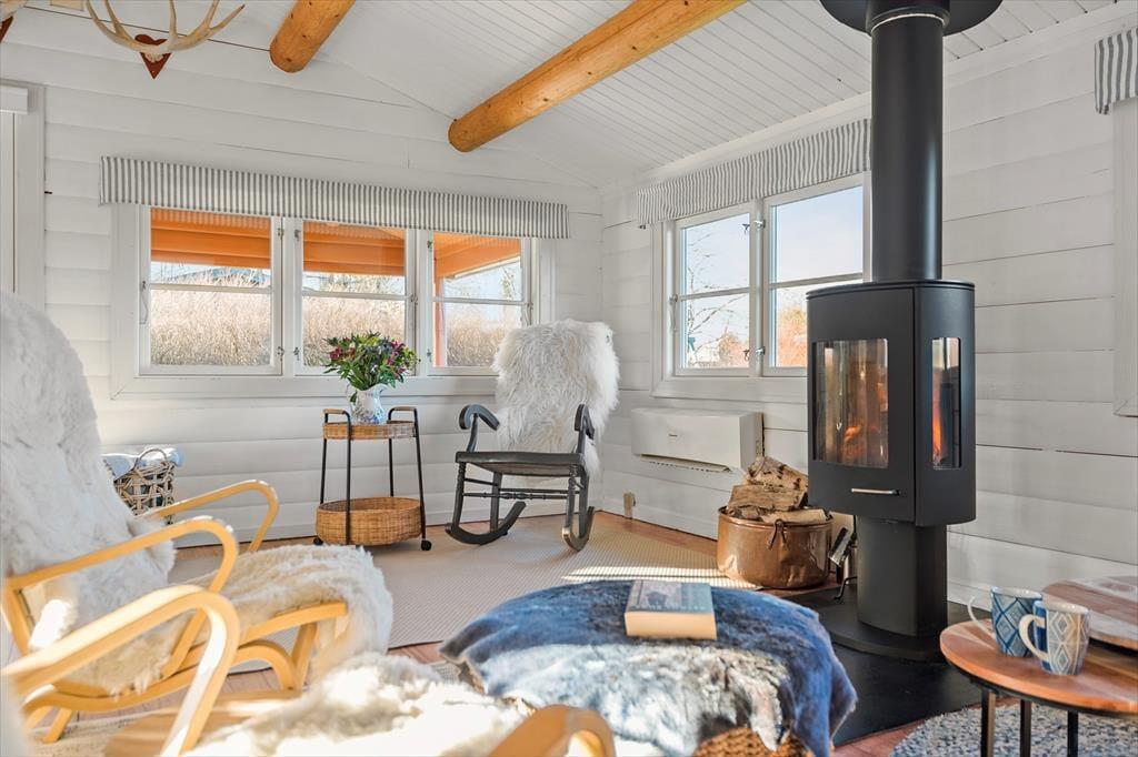 I stuen er en brændeovn, der skaber hygge og varme i de kolde perioder. Vinduerne giver et dejligt udsyn til haven samt en havedør, så der er direkte udgang til den overdækkede terrasse fra stuen og spisebordet. Udover brændeovn er huset opvarmet af el radiatorer og en varmepumpe.