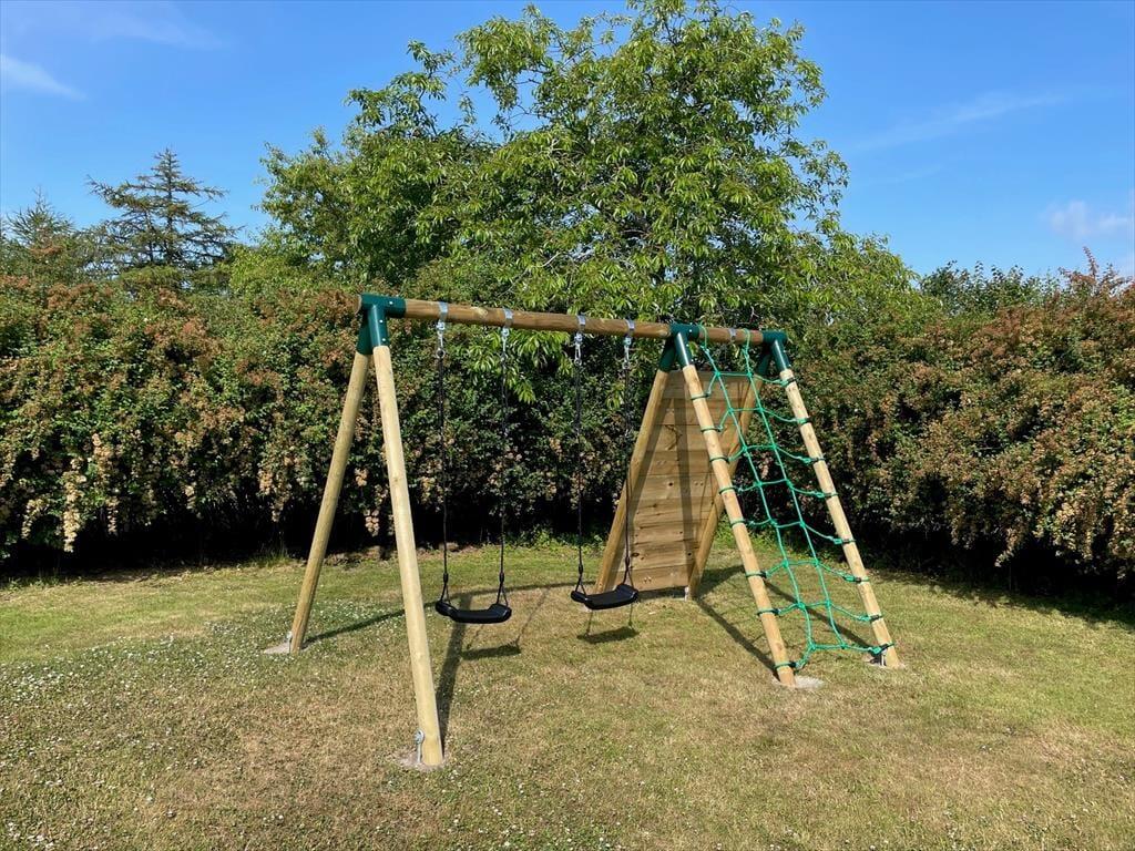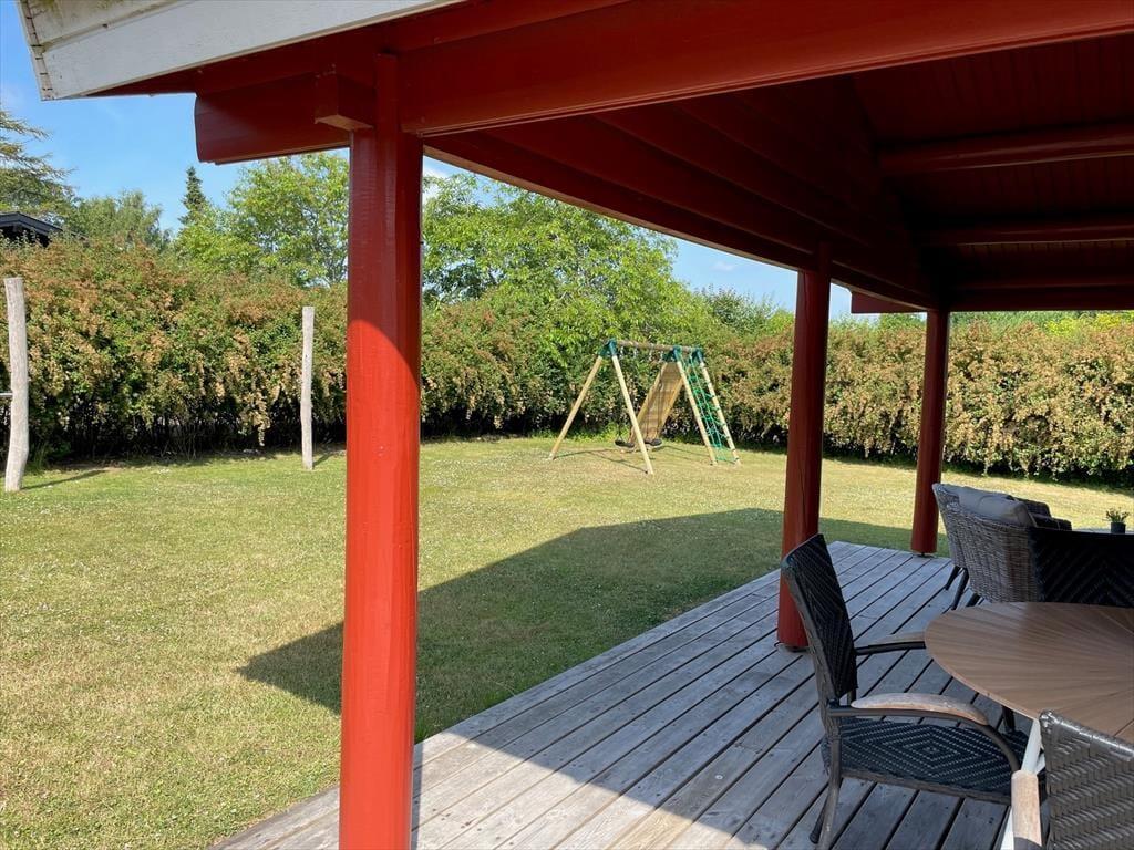 Sommerhuset har en dejlig aflukket have, der er omkranset af buske og træer, så man kan være her ugeneret for naboer. Den store græsplæne gør det muligt at lege eller spille bold, men i haven er også en sandkasse og klatre- og gyngestativ, så det er oplagt for børnefamilien, hvor alle kan bruge mange timer sammen i haven. Der er også fine højbede, hvor man i sæson kan nyde blomster og urter.