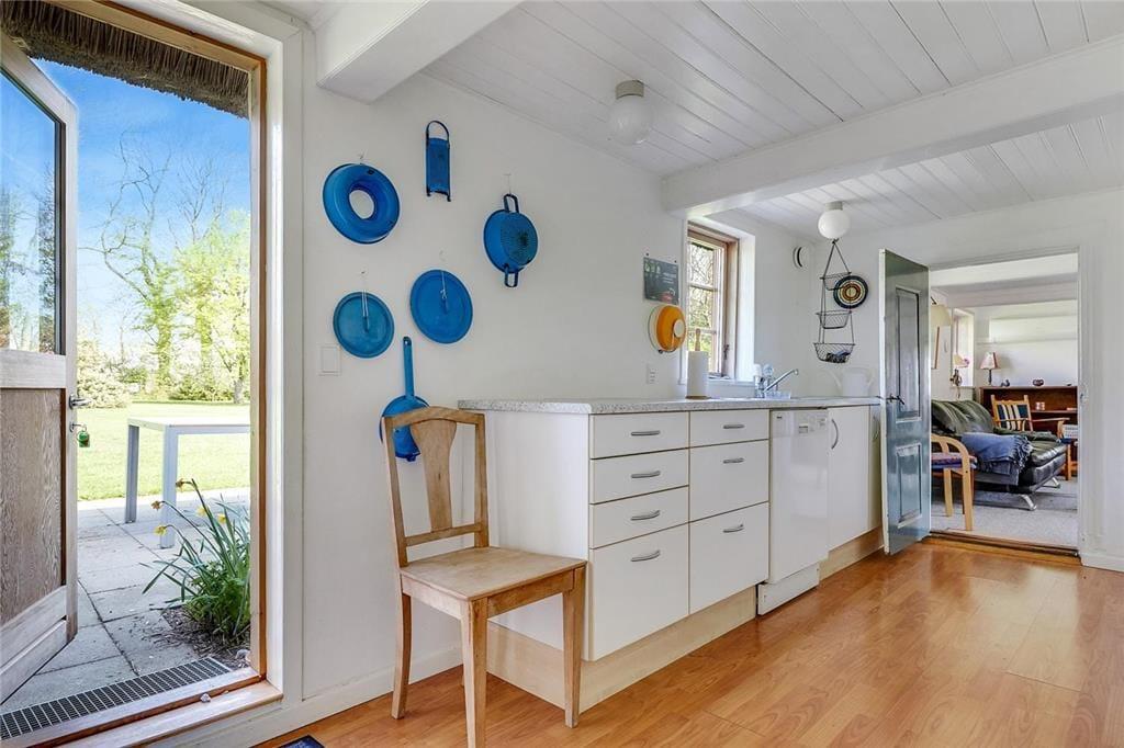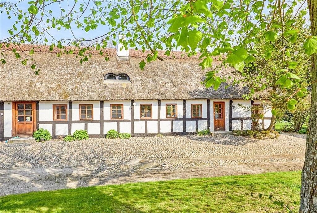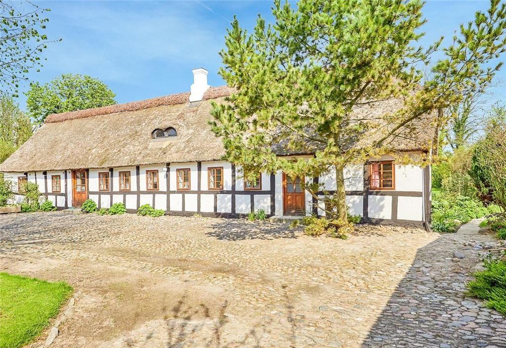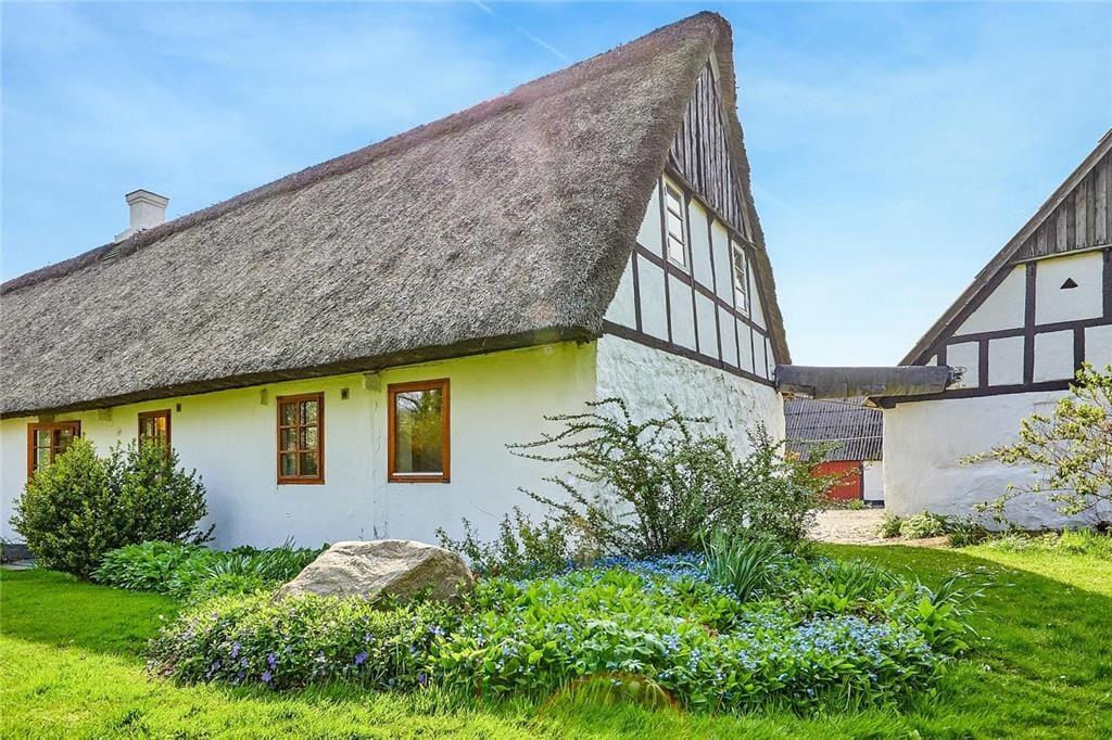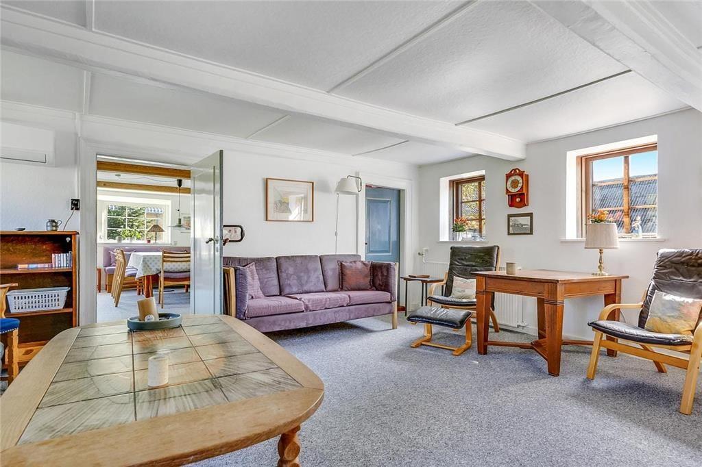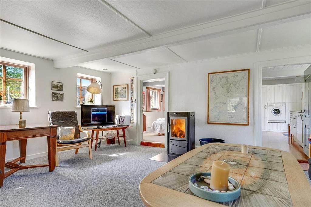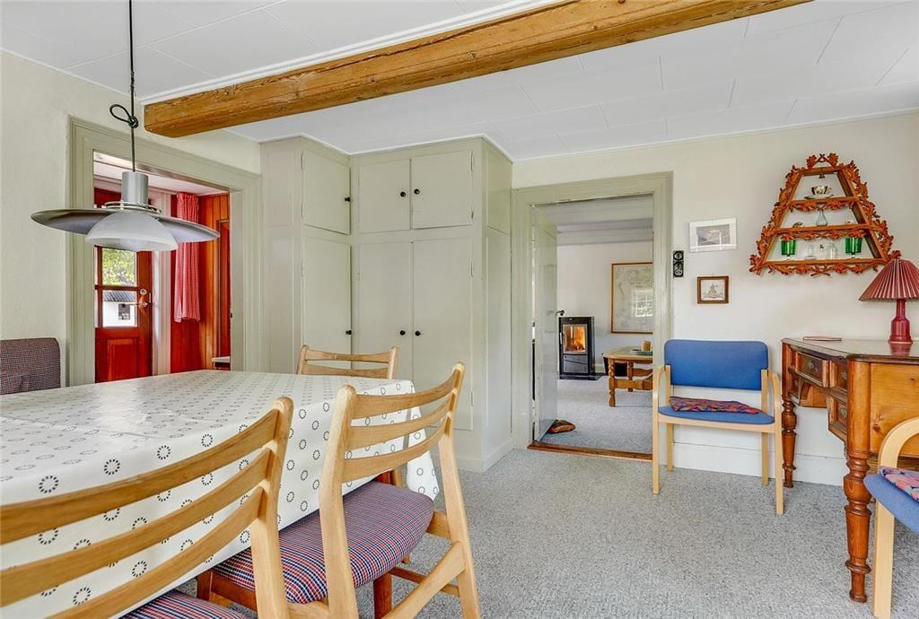 Dette charmerende hus er med stråtag og her kan man virkelig nyde den friske havluft. Overalt i huset er der sprossede vinduer. Her er et lyst nyere køkken med opvaskemaskine. Sommerhuset har 4 soverum af gode størrelser - her er i alt 5 boxmadrasser. Her er der plads til mange overnattende gæster. I stuen er der brændeovn og mange gode siddepladser til spisning og afslapning. Overalt i huset er der synlige bjælker og de flotte originale døre. Badeværelset er nyt med bruseniche, gulvvarme, vaskemaskine og tørretumbler. Sommerhuset er børnevenligt og med barneseng og barnestol.