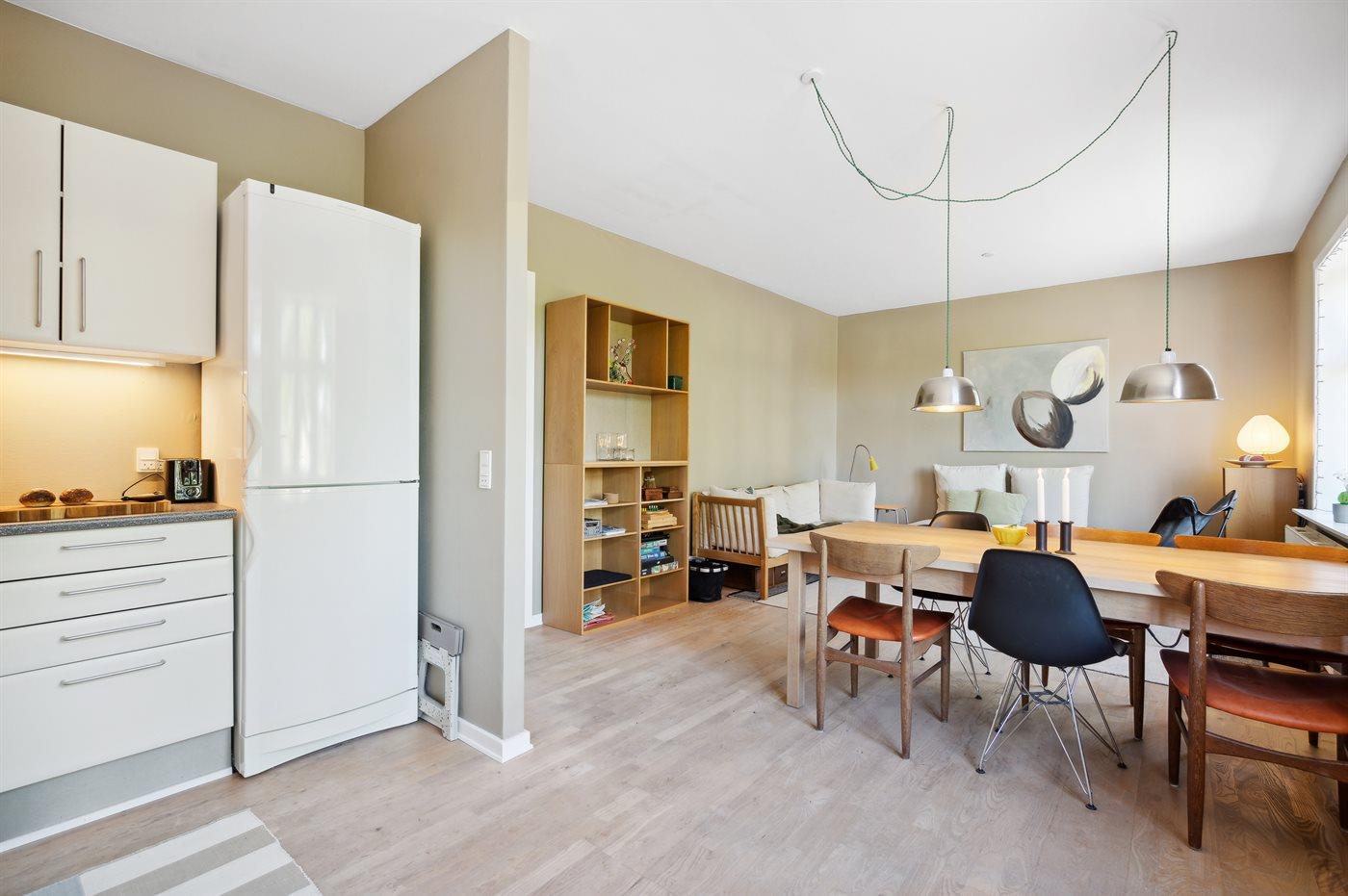 Køkkenet er udstyret med 1 køleskab. Der er 4 keramiske kogeplader, varmluftovn samt opvaskemaskine.