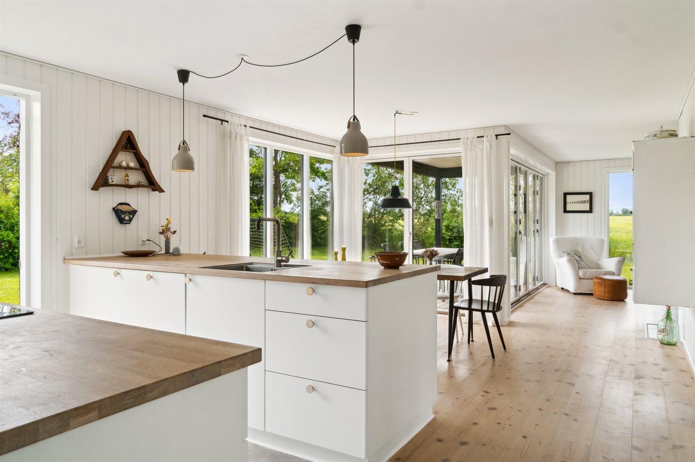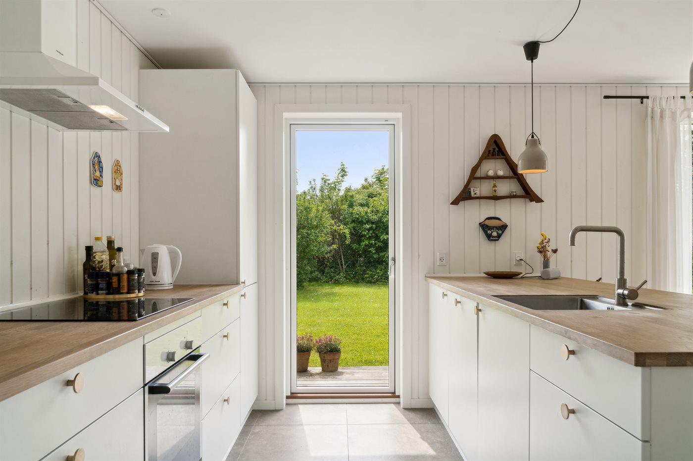 Køkkenet er udstyret med 1 køleskab. Der er 4 keramiske kogeplader, varmluftovn samt opvaskemaskine.
