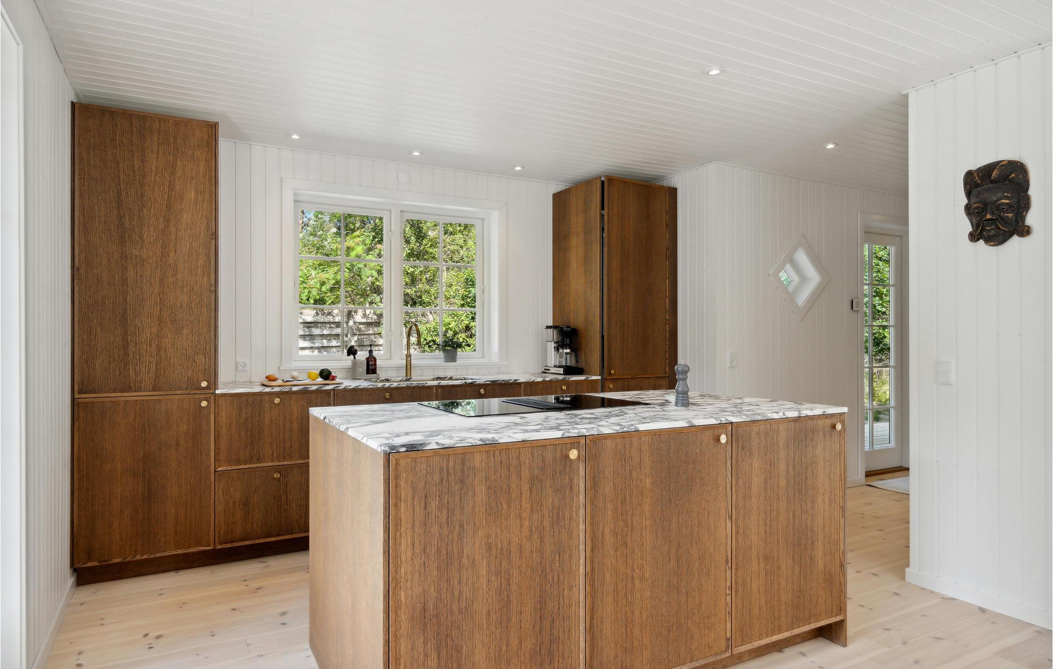 På den unikke Sjællands Odde ligger dette moderne og komfortable feriehus på en rolig og ugenert grund omgivet af idylliske nåletræer. Det stemningsfulde hus med det flotte græstag falder smukt ind i de grønne omgivelser. Her er plads til, at familie eller venner kan finde ro og koble af omgivet af dejlig natur. Interiøret er stilfuldt, og stedet udstråler luksus med møbler af høj kvalitet, smukke detaljer og lyse farver. Det brune køkken bryder det hvide på charmerende vis. Samtidig lukker de sprossede vinduer et blødt lys ind og giver rummene et strejf af nostalgi. Nyd en stille stund i det hyggelige opholdsområde med udsigt over haven eller forbered en god middag i det moderne køkken med de smukke marmorbordplader. Udenfor finder I den solrige træterrasse, der snor sig rundt om huset, og som indbyder til hyggelige stunder. Mærk roen og nyd de grønne trækroner eller køl af under den udendørs bruser på de varmeste dage. Efter morgenmaden kan I gå til stranden ved Sejerø Bugt.