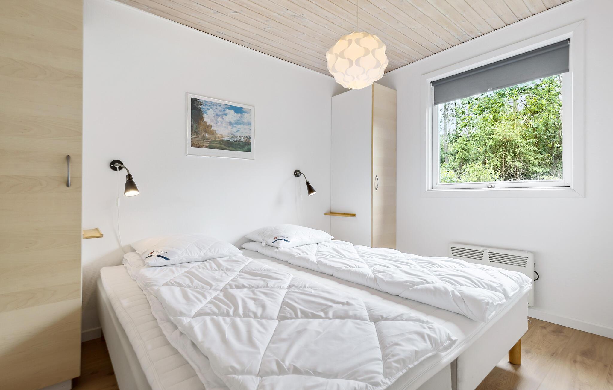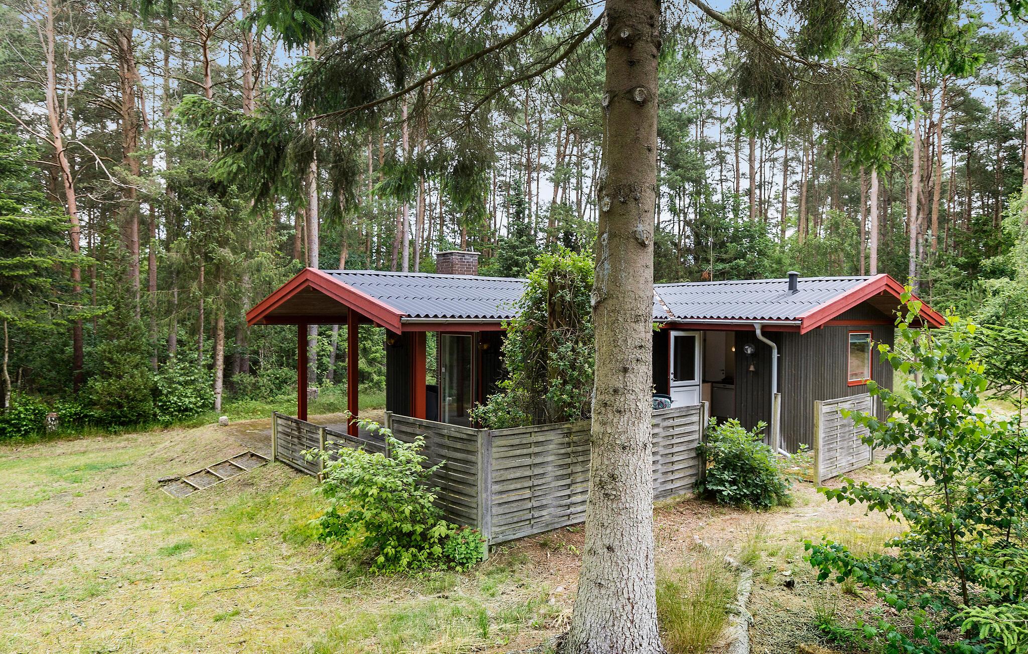 Velkommen til Ebdrup og dette helt særlige sommerhus, som ligger idyllisk placeret midt i en lille skov og er en skøn oase. Sæt hverdagen på pause og giv jer god tid til morgenmaden på den overdækkede terrasse, hvor I kan læne jer tilbage og fylde lungerne med den friske skovluft. Indendørs venter et komfortabelt opholdsområde, hvor lyset falder behageligt ind gennem store vinduespartier. På kølige dage kan I gøre det ekstra stemningsfuldt med ild i brændeovnen.