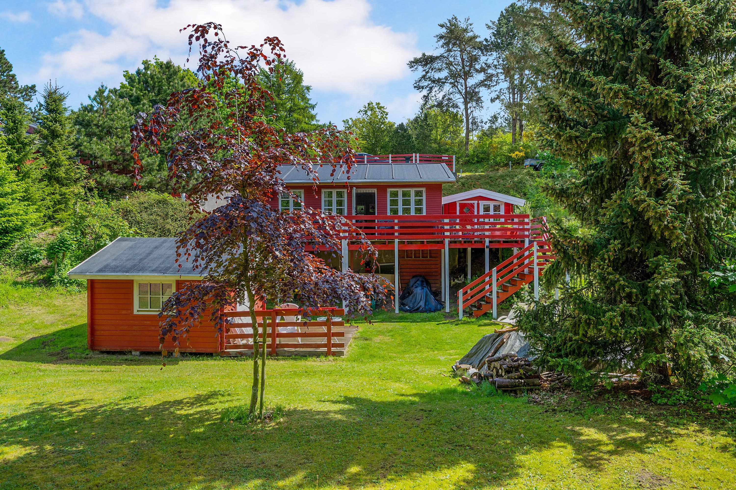 Naturskønt beliggende i hyggeligt skovområde få km fra Ebeltoft centrum, med badestrande mod øst og vest samt i gåafstand til Golfbanen, finder man dette charmerende feriehus. Skøn, sydvestvendt træterrasse med flot udsigt over den skrånende grund, hvor man bl.a. kan se græssende råvildt. Her er gode havemøbler, liggestole, parasol og grill.