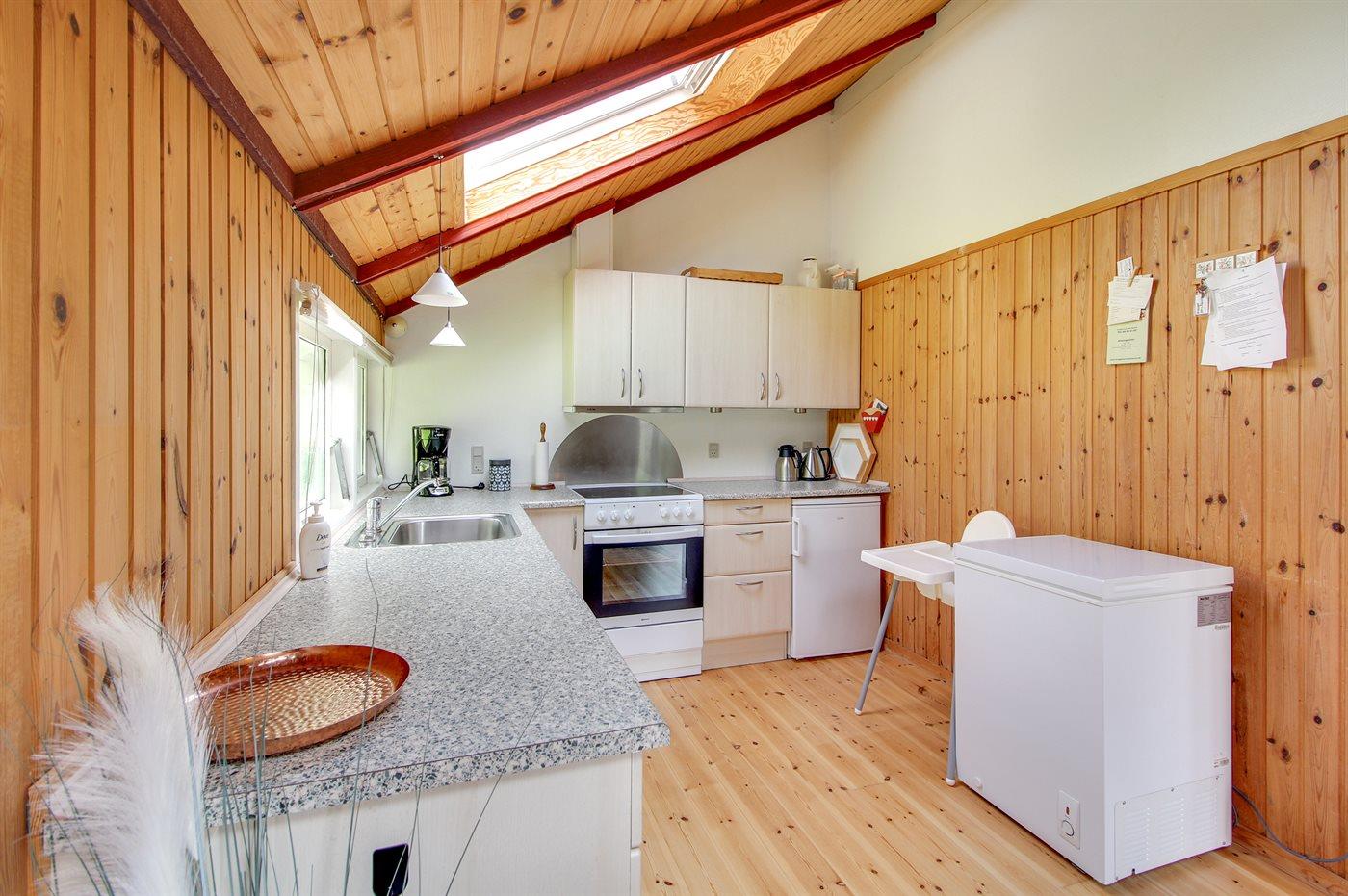 Køkkenet er udstyret med 1 køleskab. Der er 4 keramiske kogeplader, varmluftovn samt opvaskemaskine.
