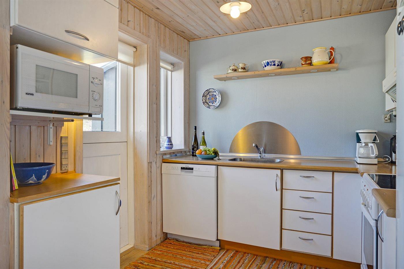 Køkkenet er udstyret med 1 køleskab. Der er 4 keramiske kogeplader, varmluftovn, mikrobølgeovn samt opvaskemaskine.