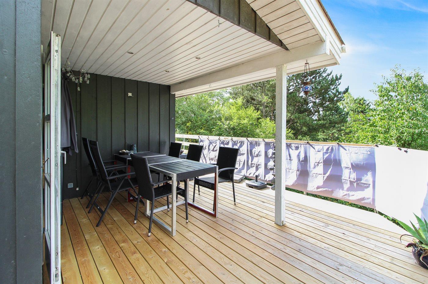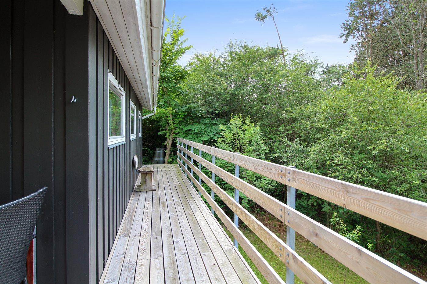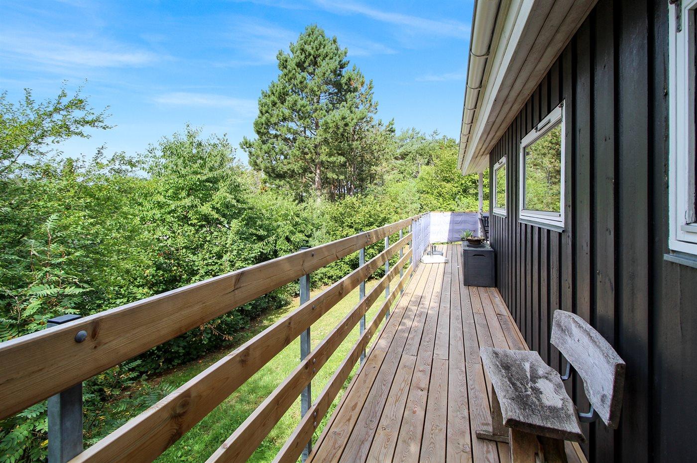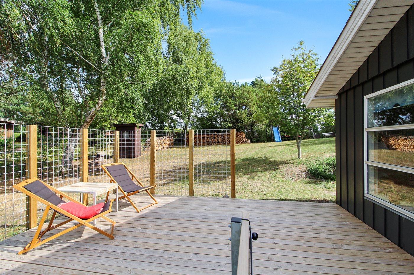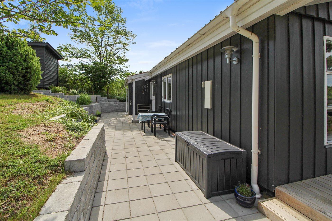 Ferieboligen er beliggende på en 1250 m² stor naturgrund. Der er 800 m til havet. Nærmeste forretning er beliggende i en afstand af 700 m. Til ferieboligen hører 30 m² terrasseareal. Desuden er der 9 m² overdækket terrasse. Gynge. Shelter. Der er grill og pizzaovn til rådighed. Parkering ved ferieboligen.