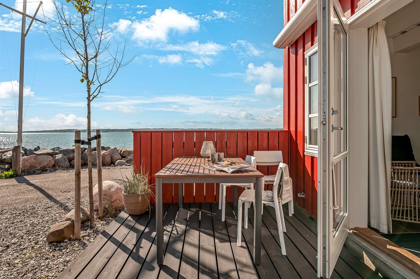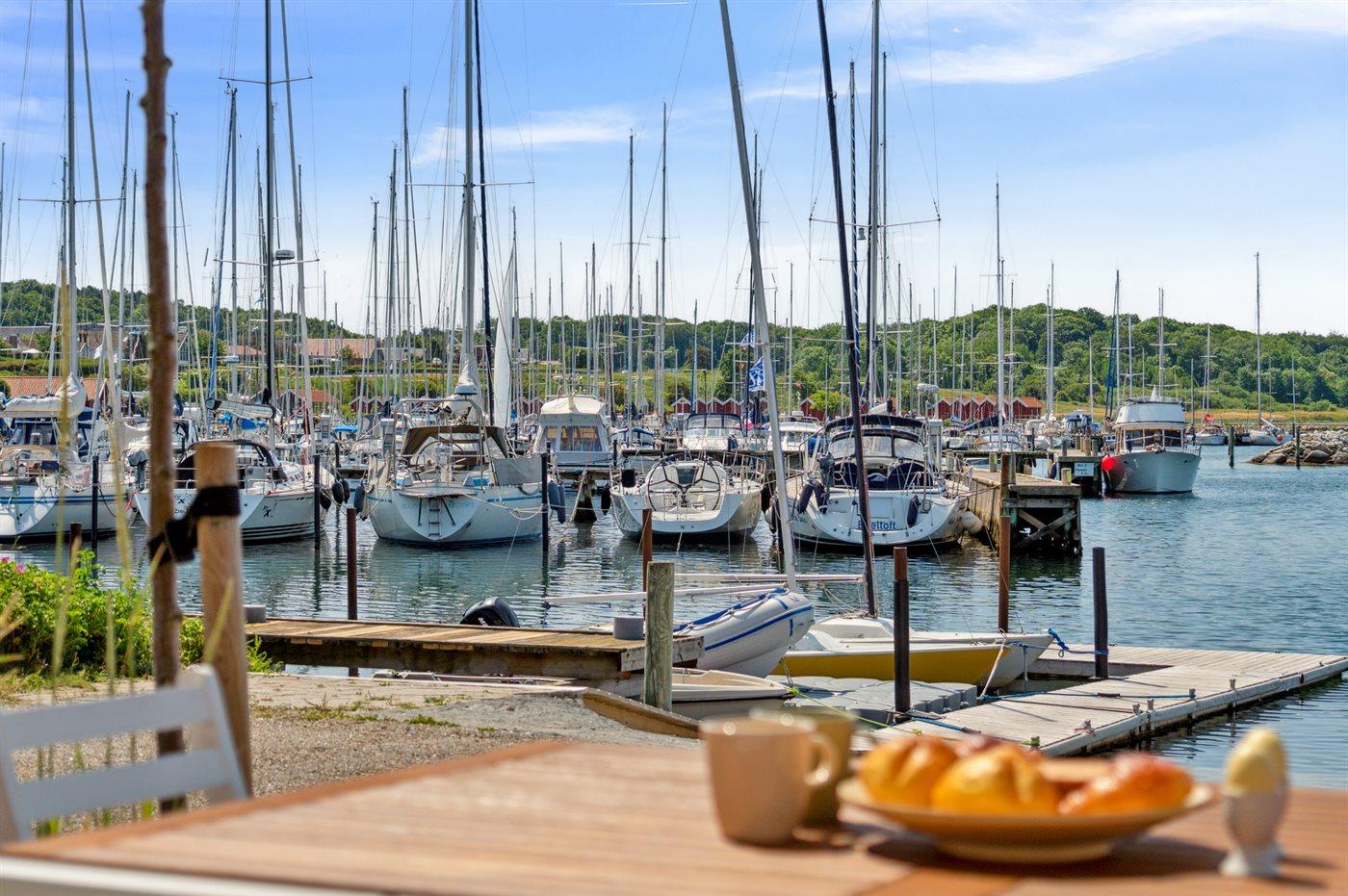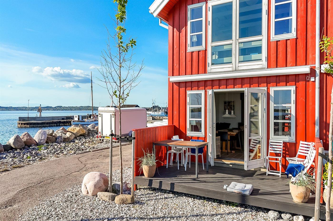 Hyggeligt rækkehus i vandkanten ved Ebeltoft havn med havudsigt og privat terrasse, perfekt til en afslappende ferie ved vandet.