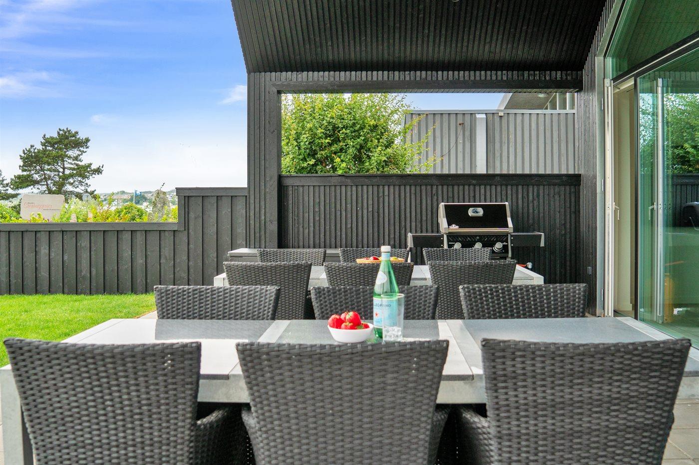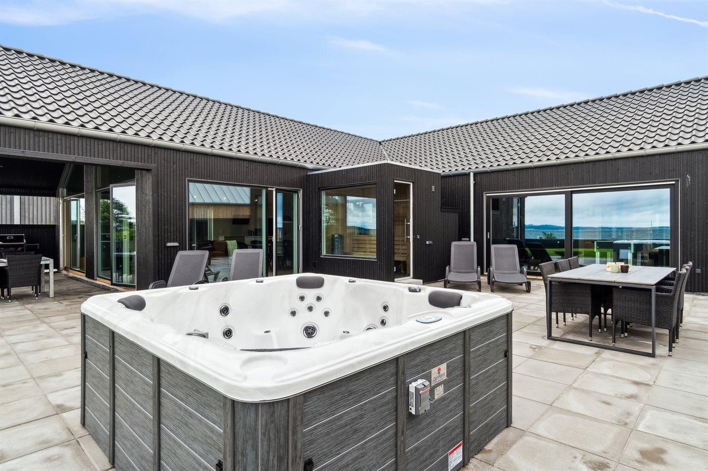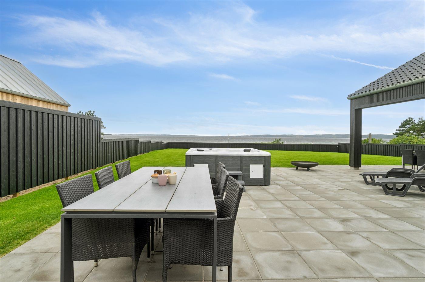 Sommerhusets store terrasse giver gode muligheder for læ og skygge. På terrassen finder du også et stort udendørs spabad, hvor man kan læne sig tilbage i boblernes massage, mens man kigger ud over Ebeltoft Vig og det smukke vand.