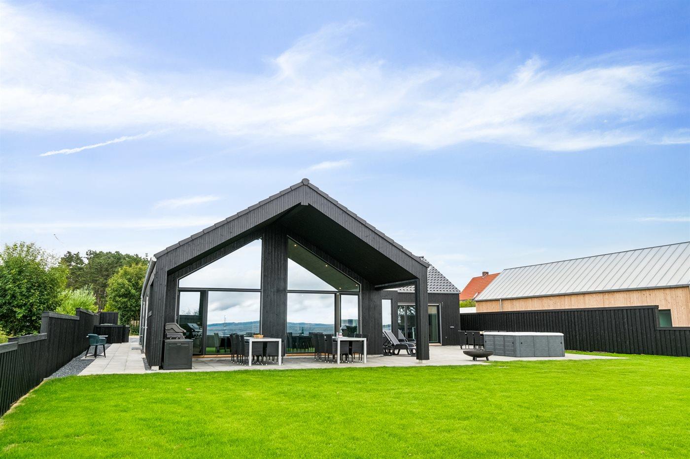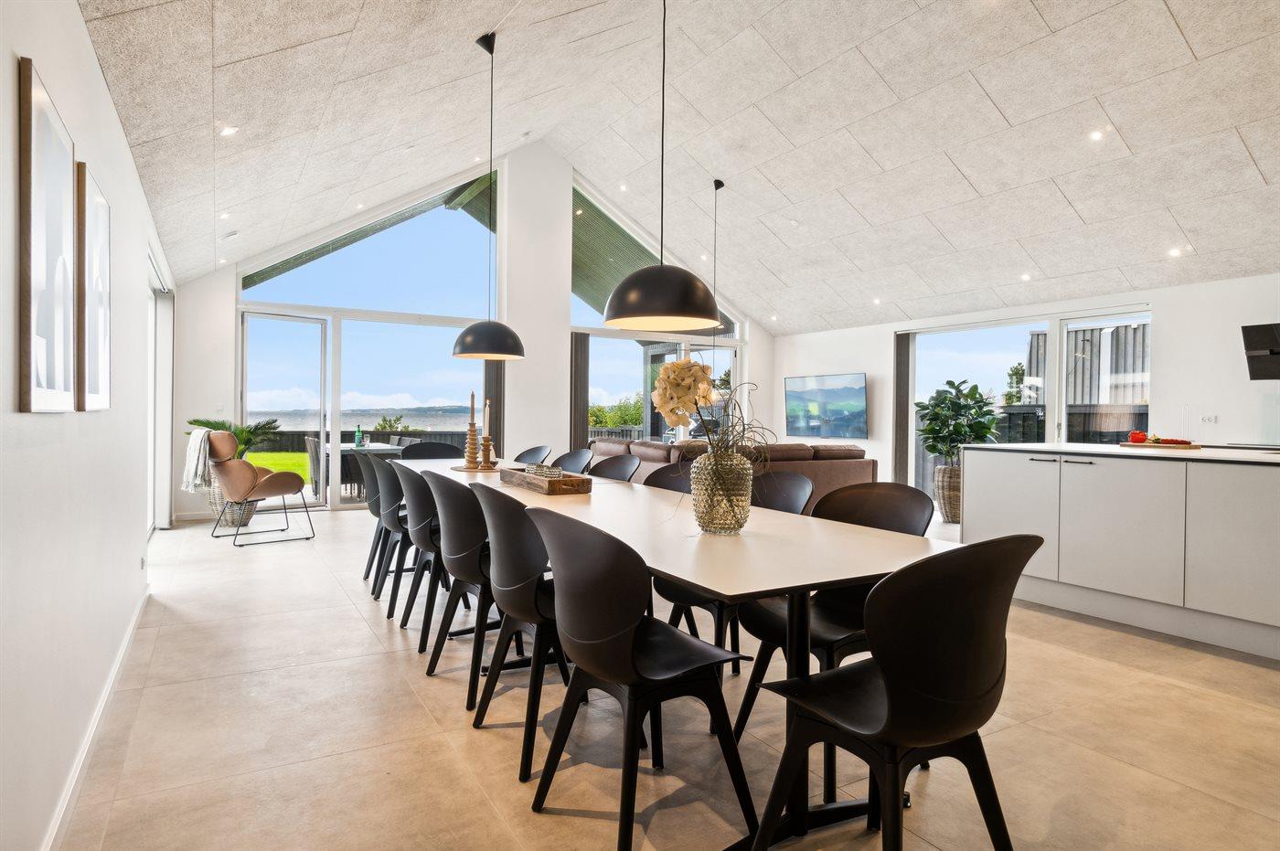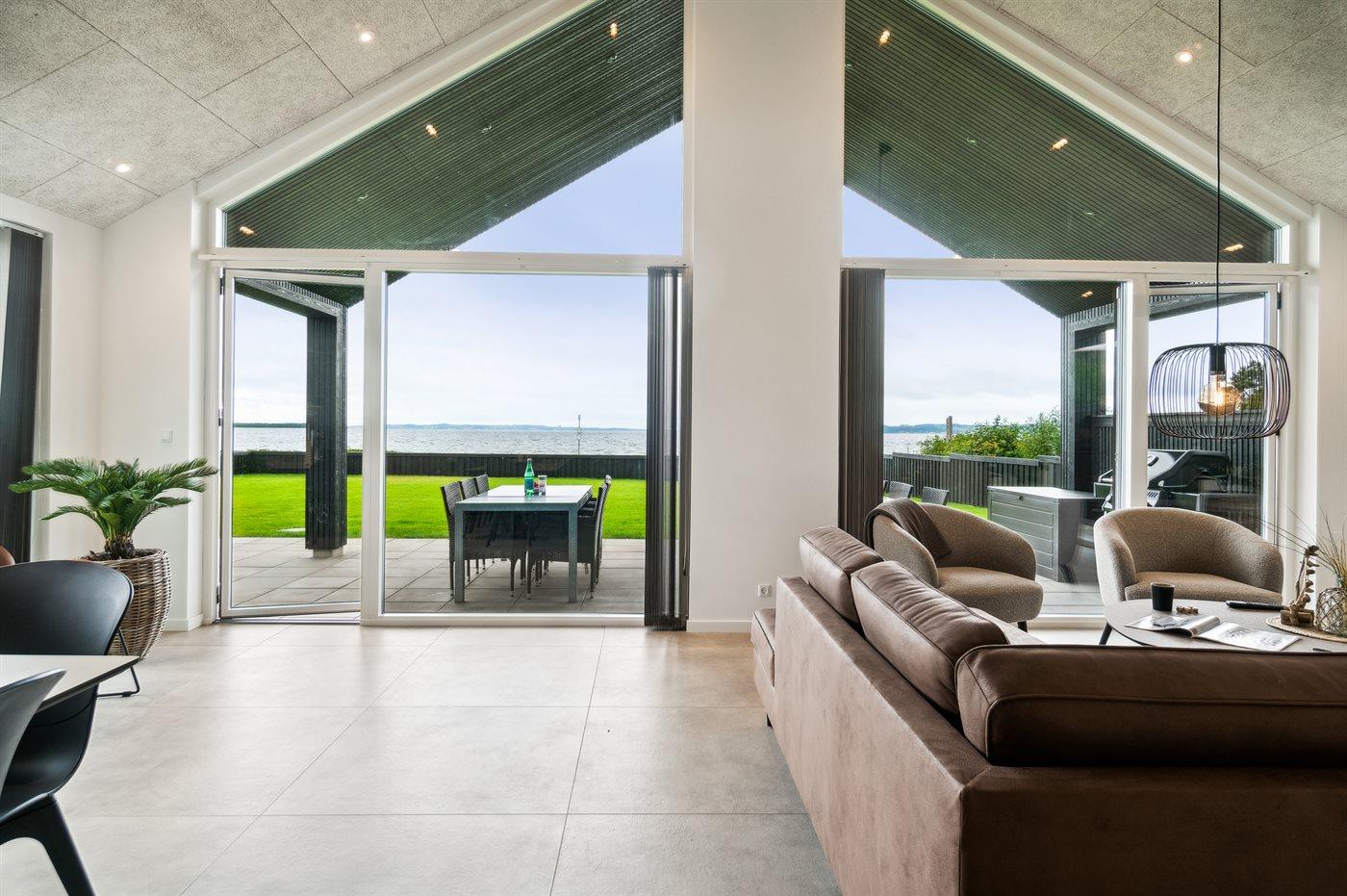 Sommerhusets store terrasse giver gode muligheder for læ og skygge. På terrassen finder du også et stort udendørs spabad, hvor man kan læne sig tilbage i boblernes massage, mens man kigger ud over Ebeltoft Vig og det smukke vand.