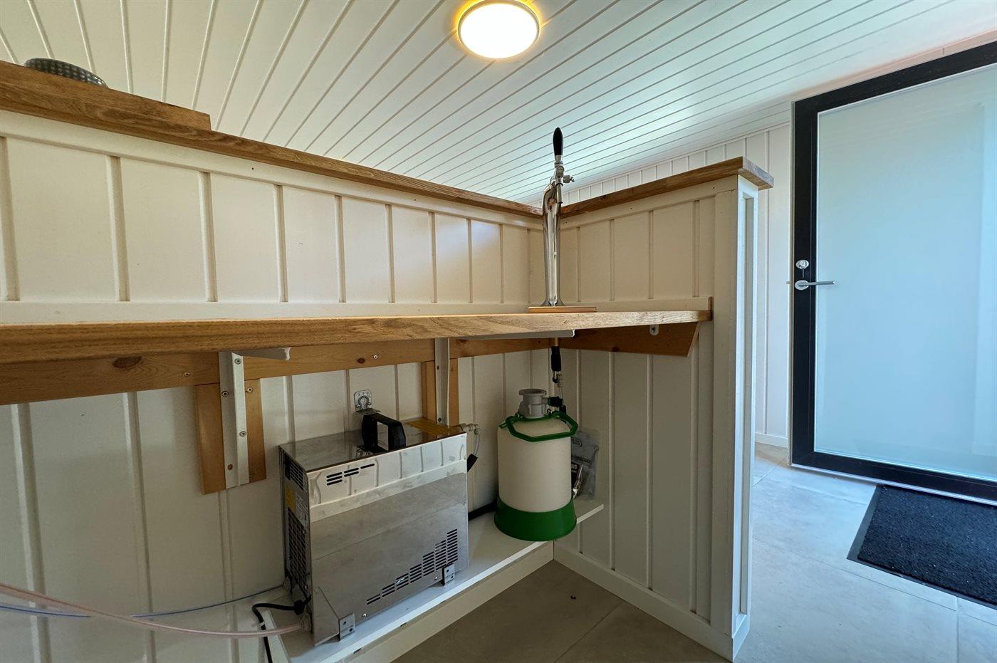 Ferieboligen er beliggende på en 1186 m² stor naturgrund. Grunden er indhegnet. Der er 50 m til havet. Nærmeste forretning er beliggende i en afstand af 100 m. Til ferieboligen hører åbent terrasseareal. Desuden er der overdækket terrasse. Udendørs sauna. Udendørs bruser. Grill til rådighed. Der er installeret stik til opladning af elbil. Type 2 stik. Med 11 kW ladeeffekt. Parkering ved ferieboligen.