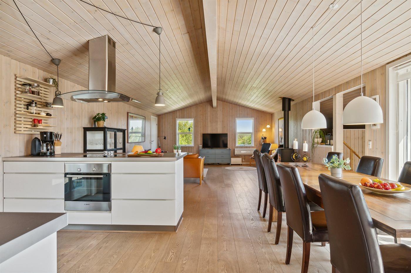 Køkkenet er udstyret med 1 køleskab. Der er 4 keramiske kogeplader, varmluftovn, mikrobølgeovn samt opvaskemaskine.