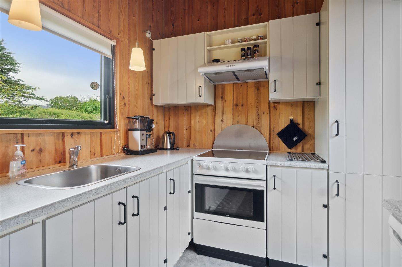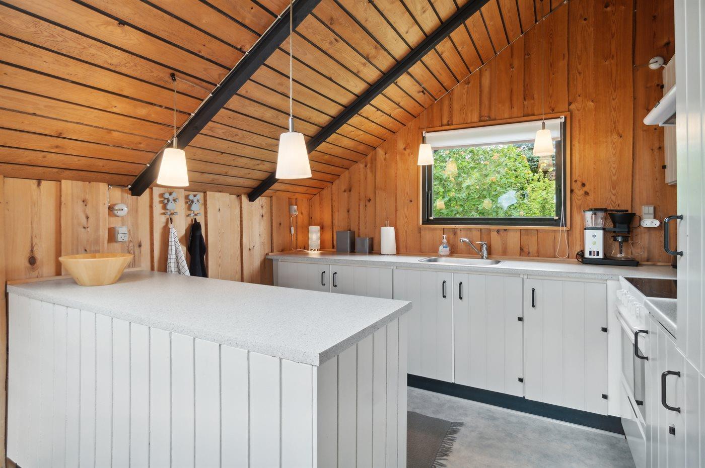 Køkkenet er udstyret med 1 køleskab. Der er 4 keramiske kogeplader, varmluftovn, mikrobølgeovn samt opvaskemaskine.