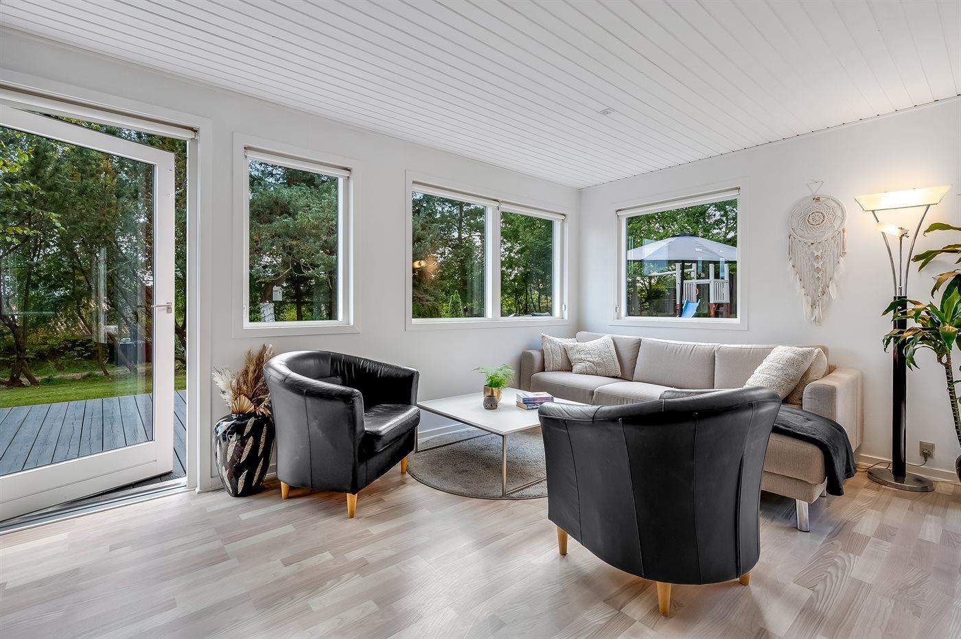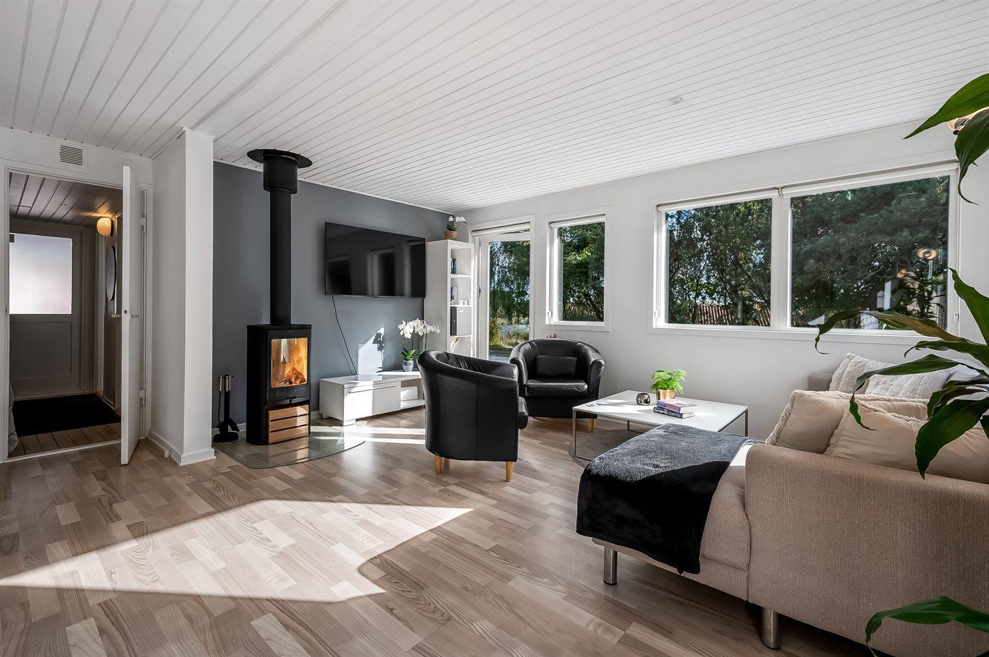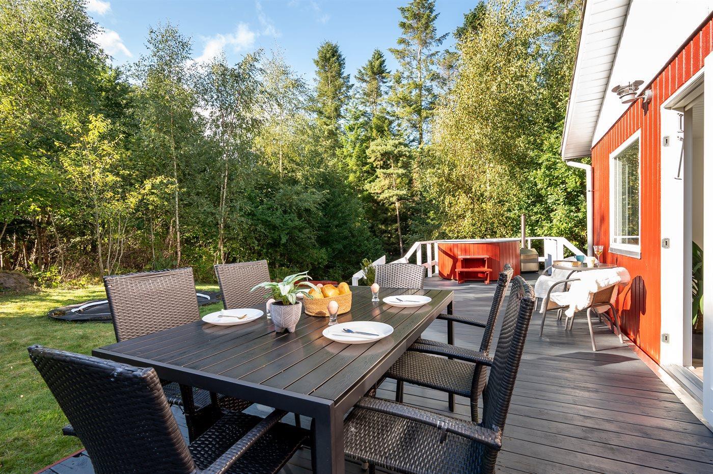 Sommerhuset har en entre med to soveværelser og bad/wc. Køkken og spisestue samt stuen med brændeovn er i samme åbne afdeling. Fra stuen er der udgang til stor terrasse, både overdækket og åben, hvor der står et vildmarksbad, som er omkranset af den grønne skov bagved.