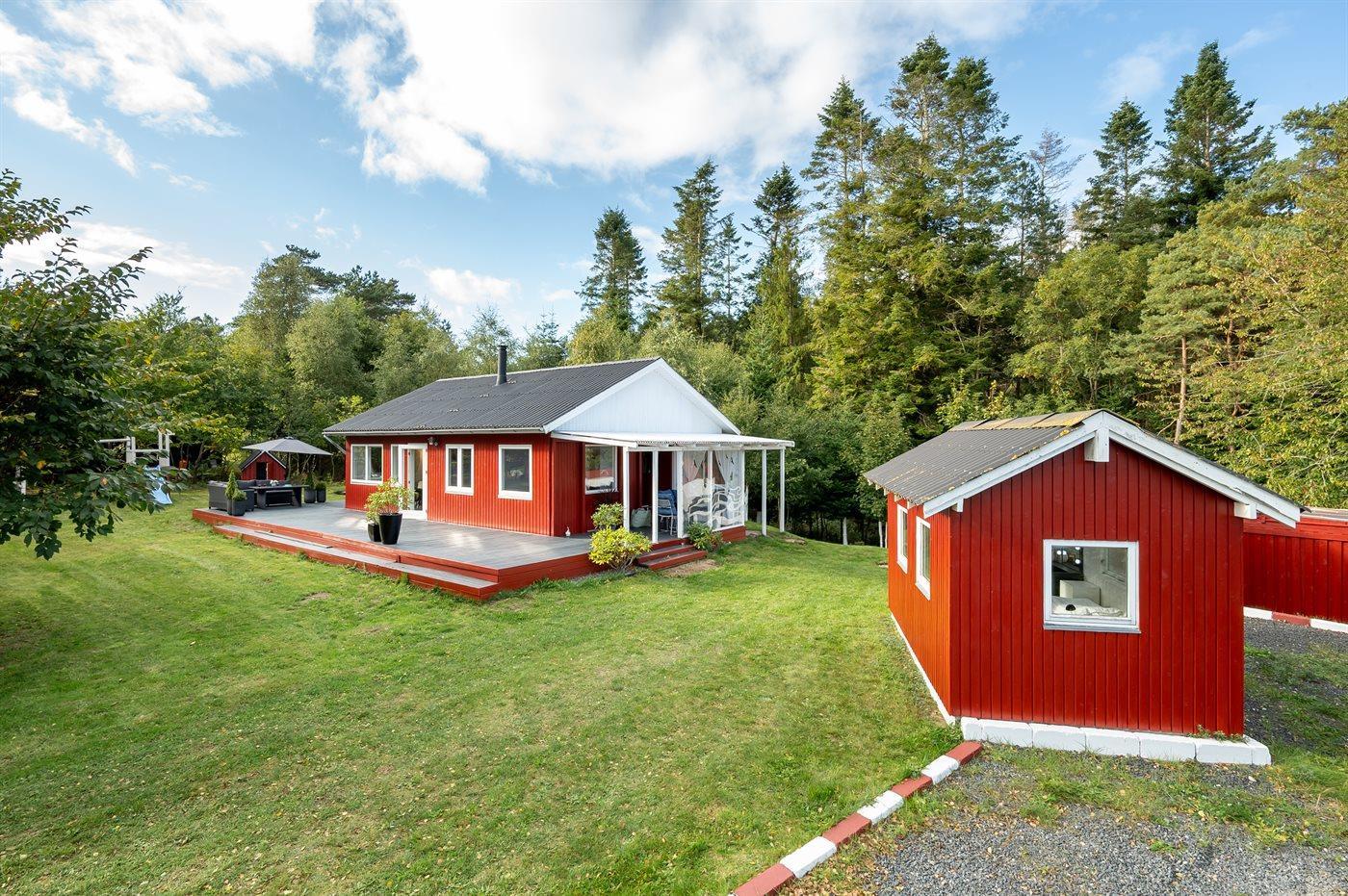 Hyggeligt sommerhus nær sø og skov med vildmarksbad og stor terrasse i Ebeltoft.