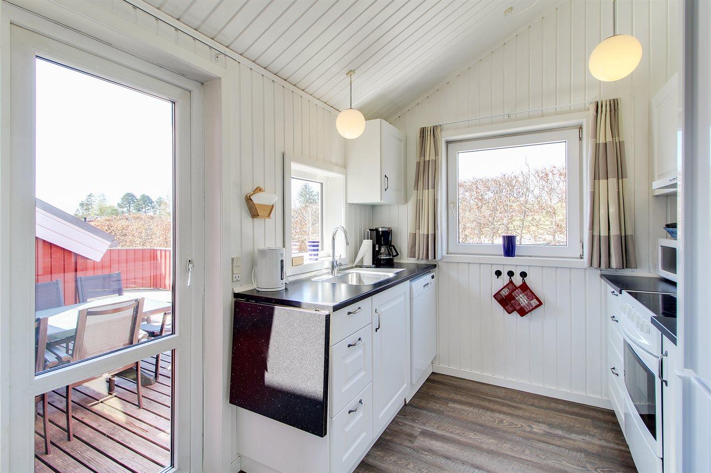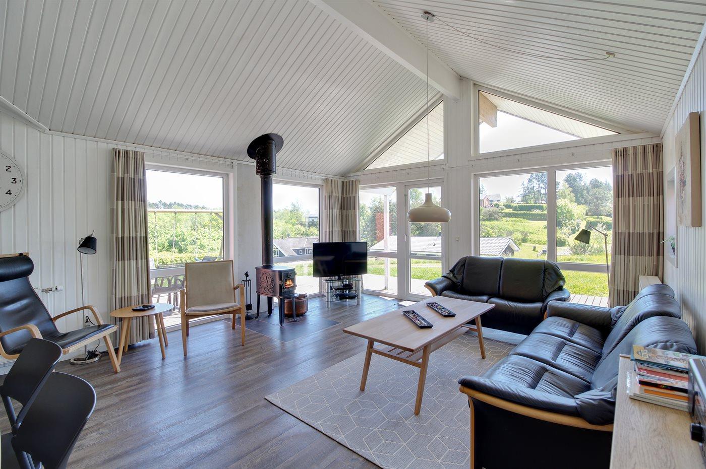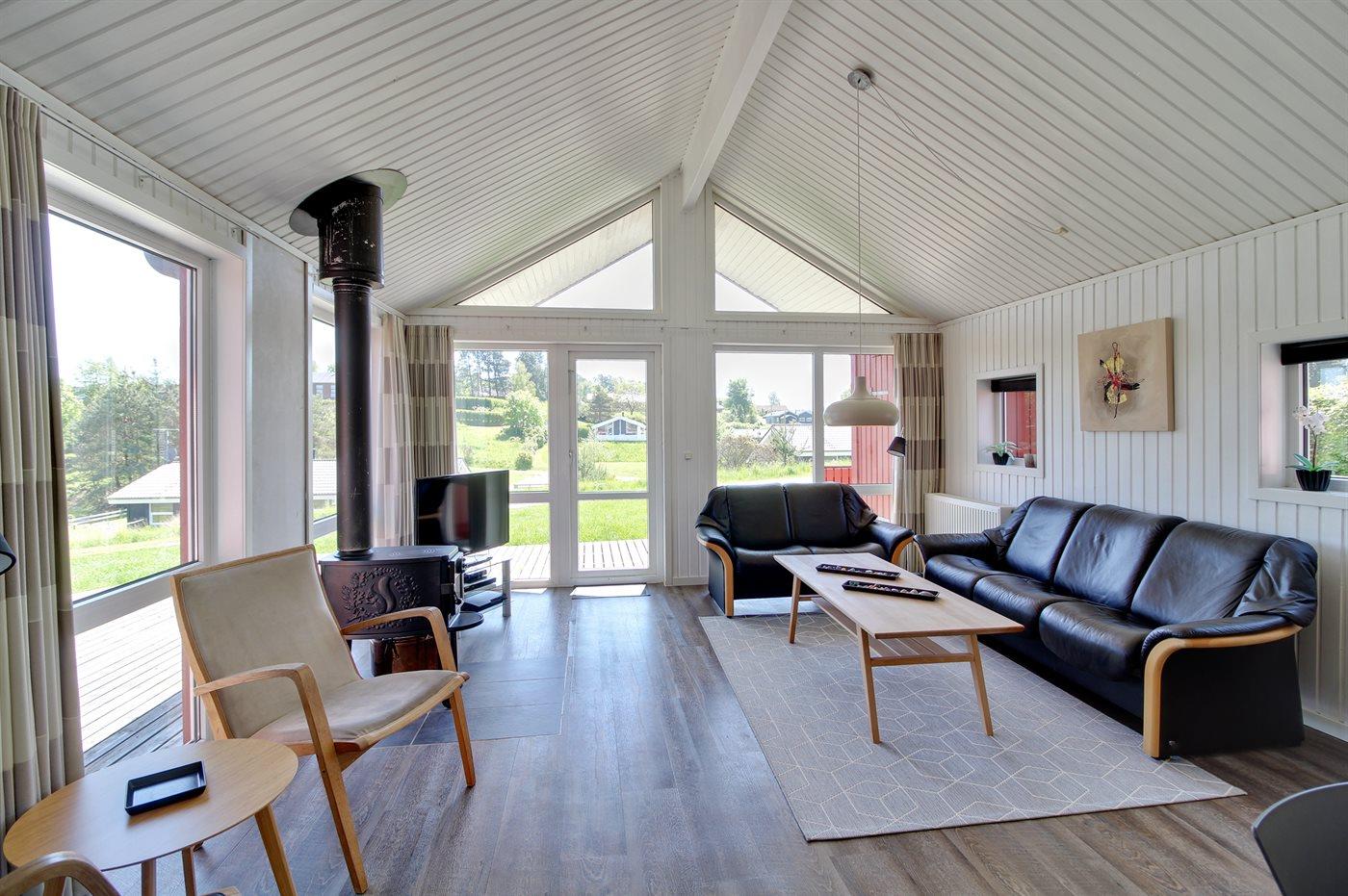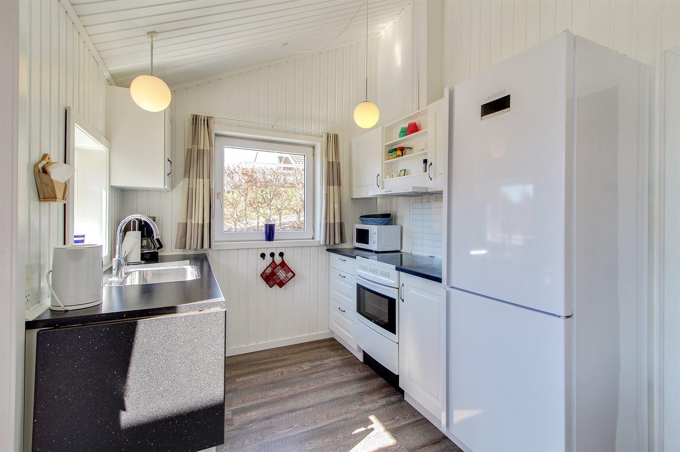 Køkkenafdelingen er kombineret med opholdsstuen og er bl.a. udstyret med fryser, opvaskemaskine, mikrobølgeovn og komfur med keramiske kogeplader. Den hyggelige opholdsstue indeholder brændeovn, radio, stereoanlæg med CD-afspiller samt 42" fladskærms-TV med parabol (digital), Chromecast, DVD-afspiller, Playstation3 og video. Gratis, trådløs internetforbindelse (egen computer skal medbringes).