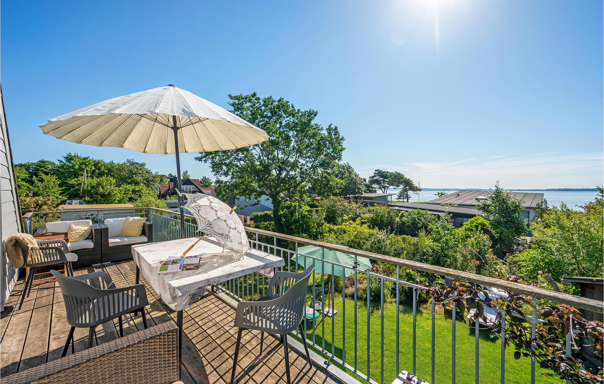 Når solen skinner, kan I sætte jer ud på terrassen, hvor I måske bedst kan nyde den store force ved huset, nemlig den vidunderlige udsigt til Aarhus Bugt og det vidunderlige kystlandskab på Mols, som I kan se i horisonten. Vil I også nyde solen de lange sommeraftener, kan I selvfølgelig også slutte dagen af ??på den overdækkede terrasse på den anden side af huset.