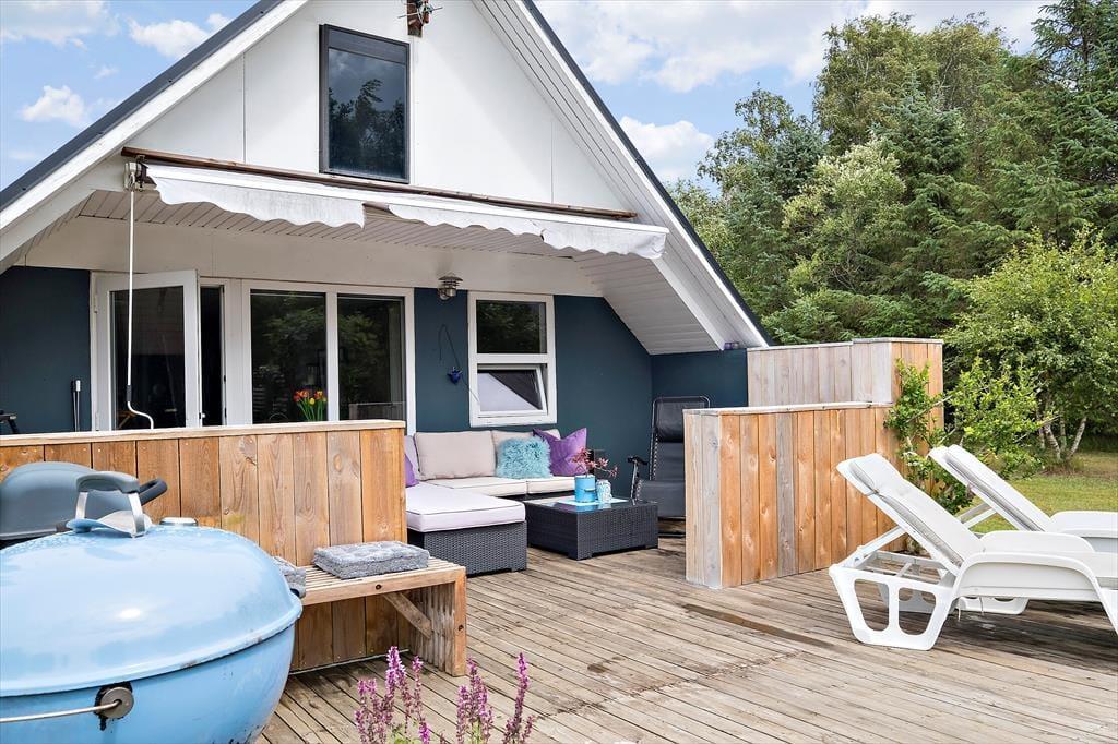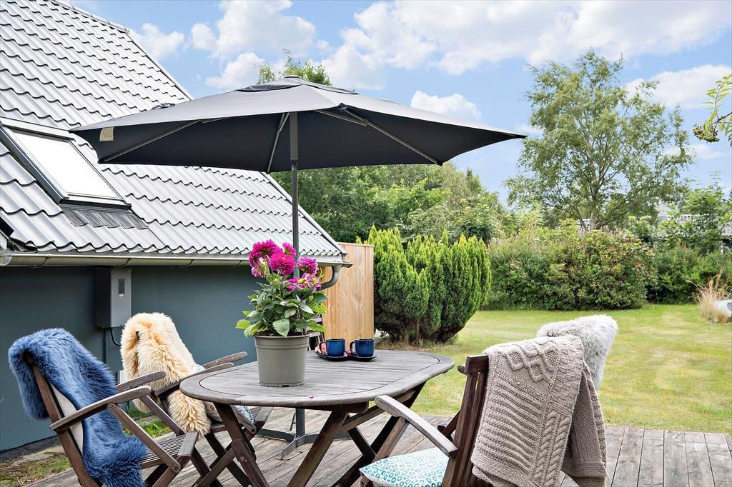 Fra opholdsrummet har I direkte adgang til to træterrasser: Den ene er sydvendt, delvist afskærmet og udstyret med en markise, mens den vestvendte har et udtrækkeligt læsejl. Får I lyst til at komme op af havestolene, har I god plads til leg og boldspil på græsplænen, og til børnene er der en trampolin på den 1249 m2 store grund.