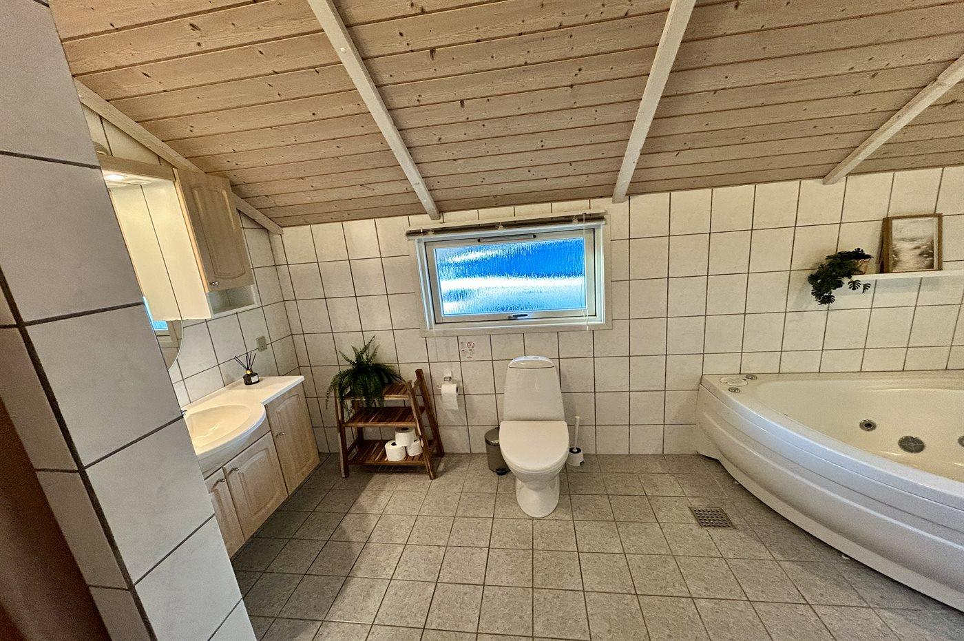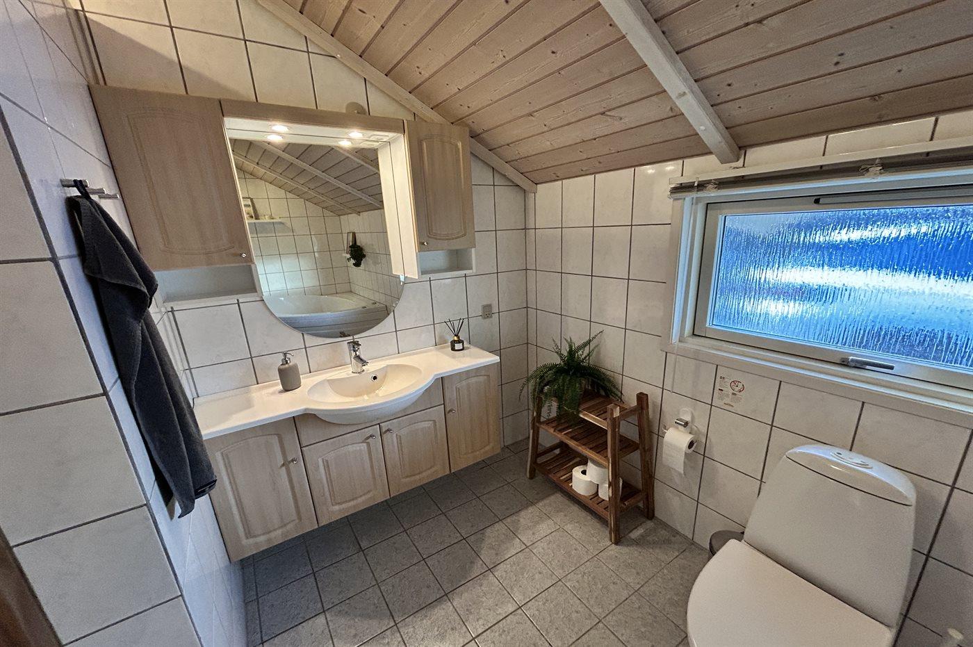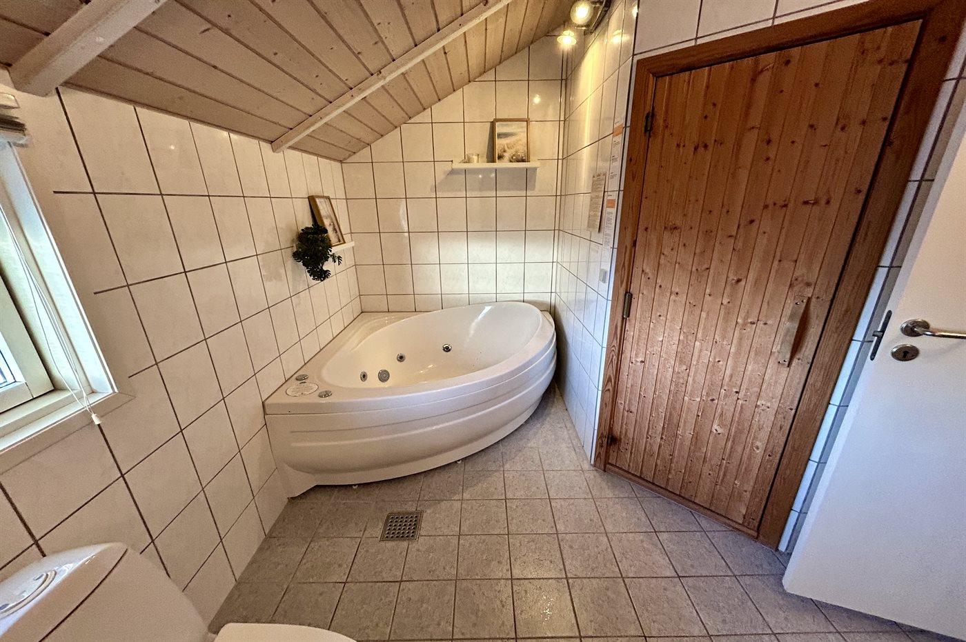 Der er 1 badeværelse med bruseniche og 2 toiletter, heraf 1 gæstetoilet. Der er gulvvarme på 1 badeværelse. I saunaen er der mulighed for afslapning.