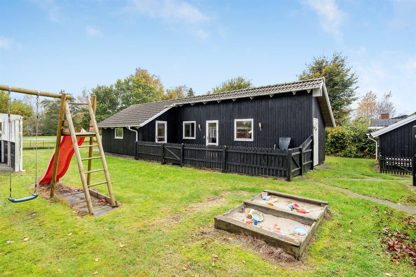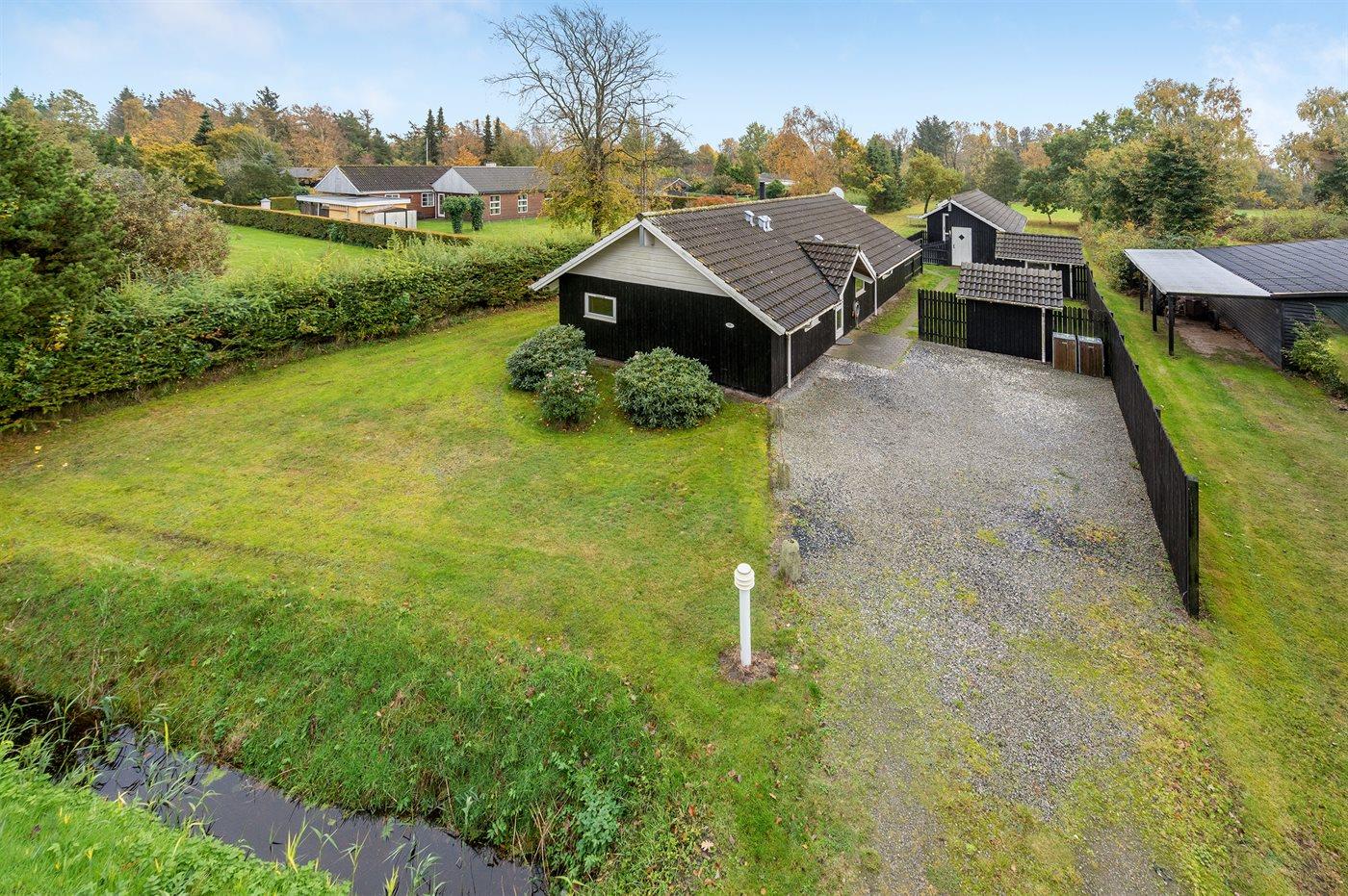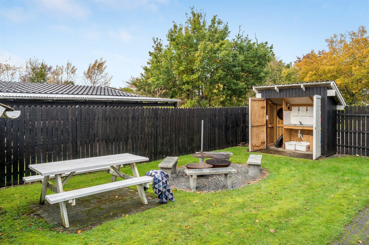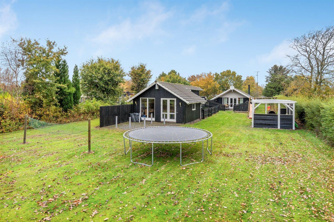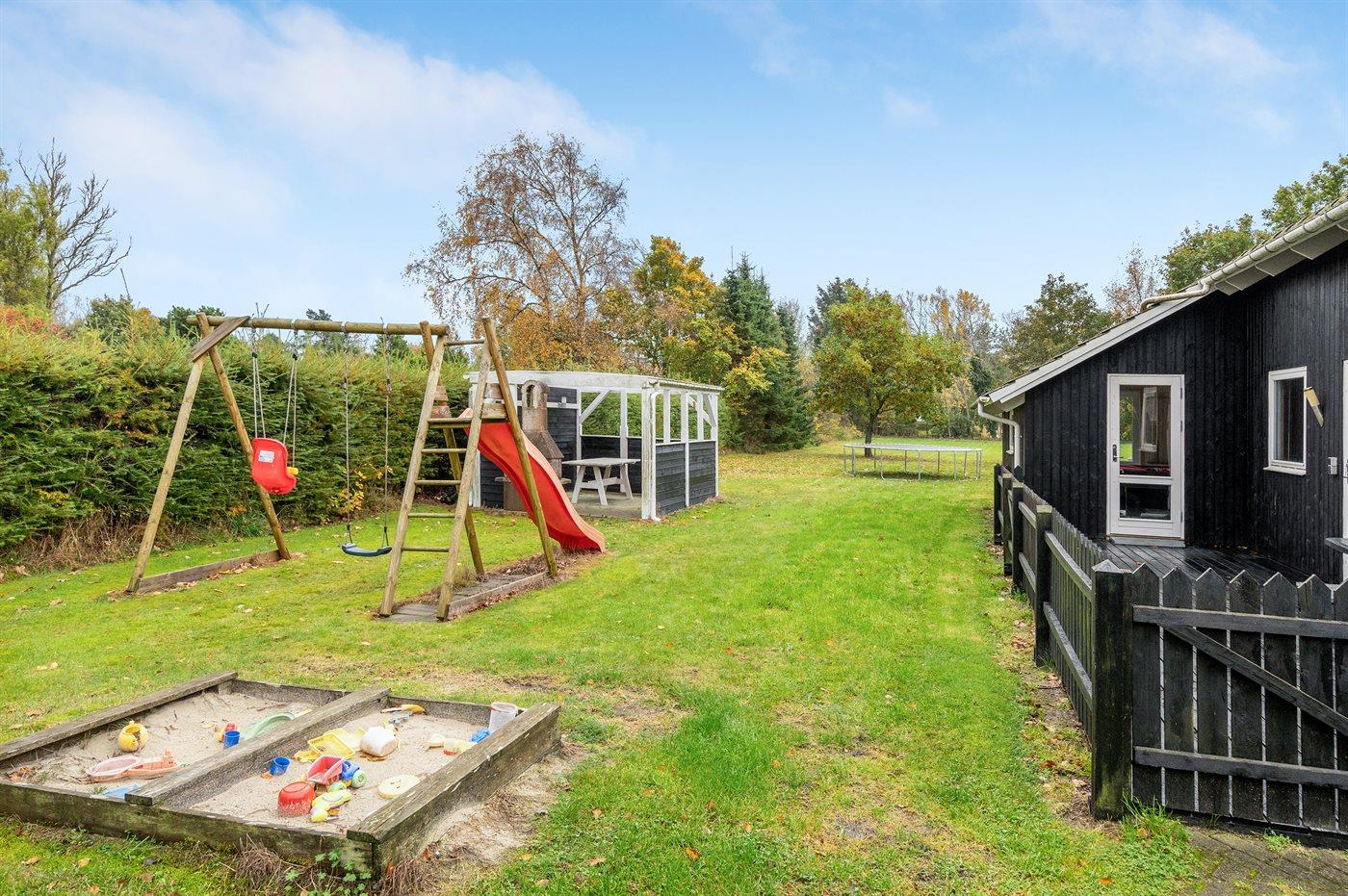 Ferieboligen er beliggende på en 1300 m² stor havegrund. Der er 1300 m til havet. Der er 350 m til fjorden. Nærmeste forretning er beliggende i en afstand af 600 m. Til ferieboligen hører 30 m² terrasseareal. Desuden er der 10 m² overdækket terrasse. Der er redskabsrum. Gynge. Sandkasse. Legehus. Trampolin. Bålsted. På lune aftener sørger en udendørs pejs for hyggelig stemning. Der er mulighed for at tilberede maden udendørs i udekøkkenet. Der er installeret stik til opladning af elbil. Med 11 kW ladeeffekt. Parkering ved ferieboligen.