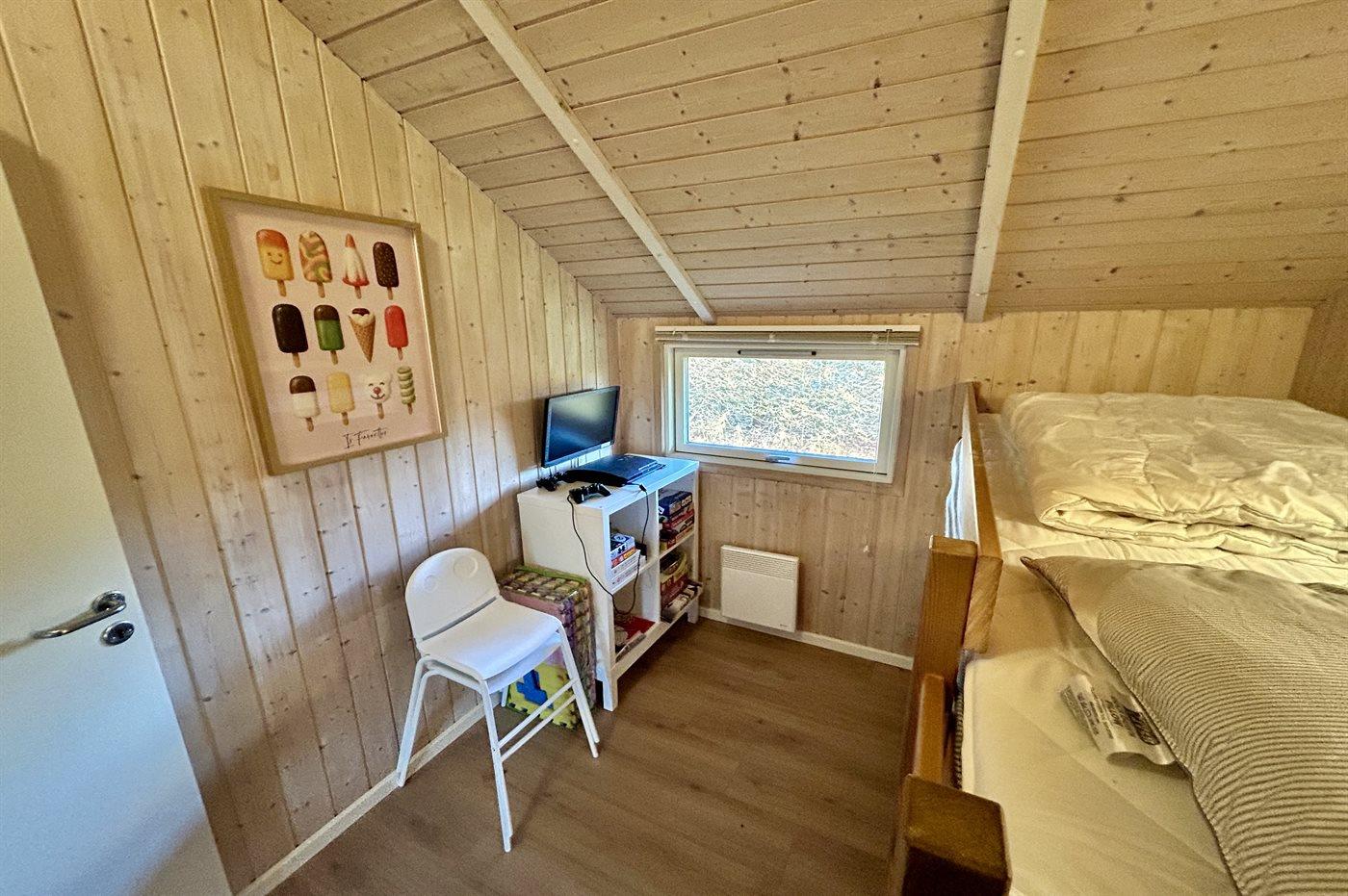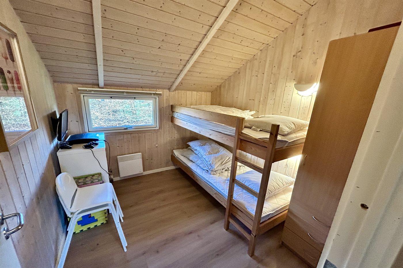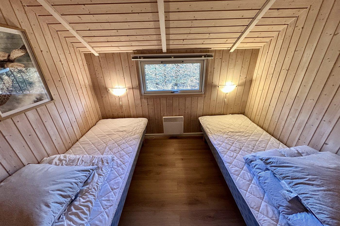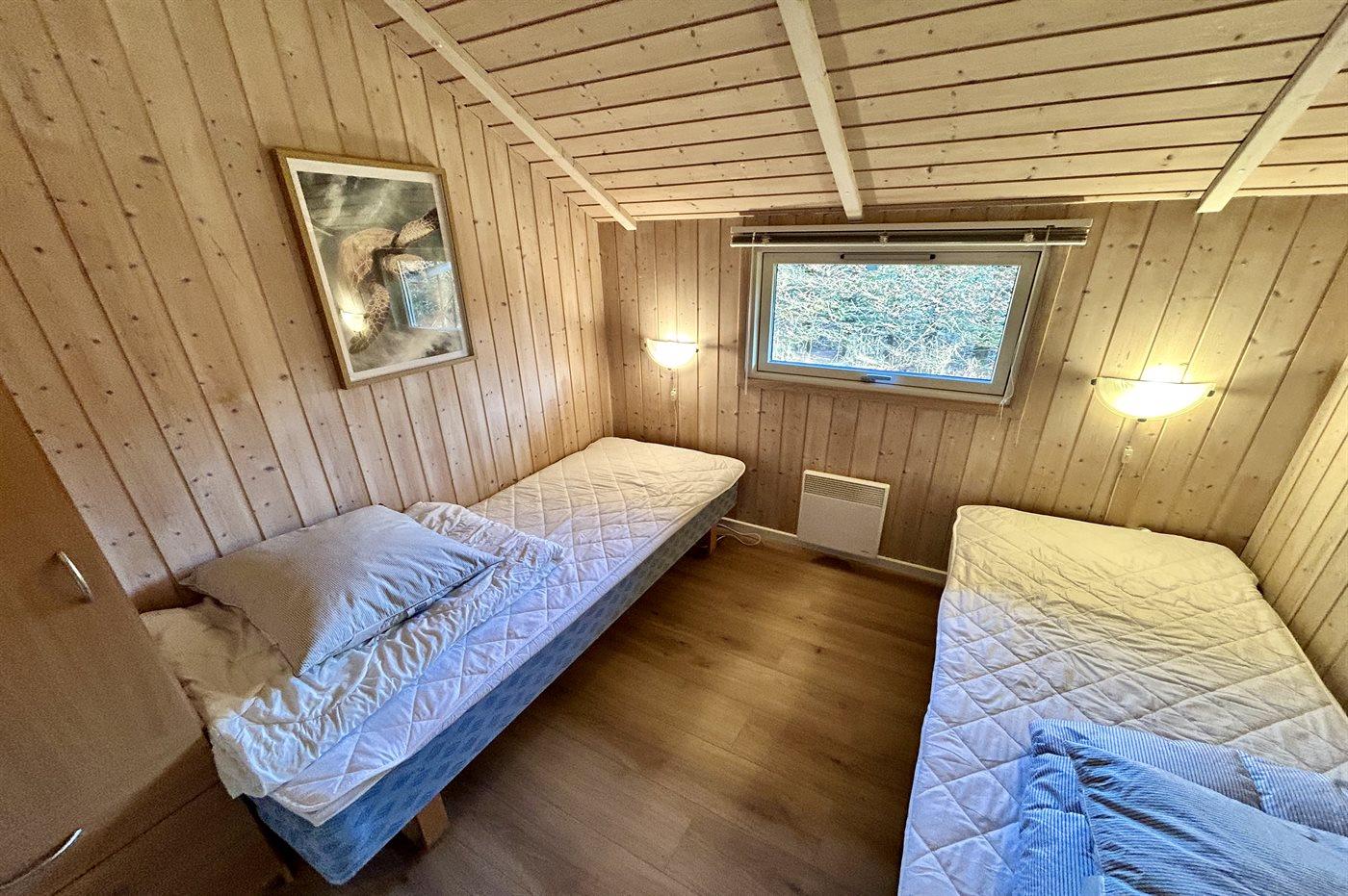 Der er i alt 5 soveværelser. Sovepladserne fordeler sig på: 2 sovepladser i dobbeltseng. 4 sovepladser i enkeltsenge. 4 sovepladser i køjesenge. 4 af disse sovepladser befinder sig i et anneks (fordelt på 2 soveværelser). Derudover er der 1 stk. barneseng.
