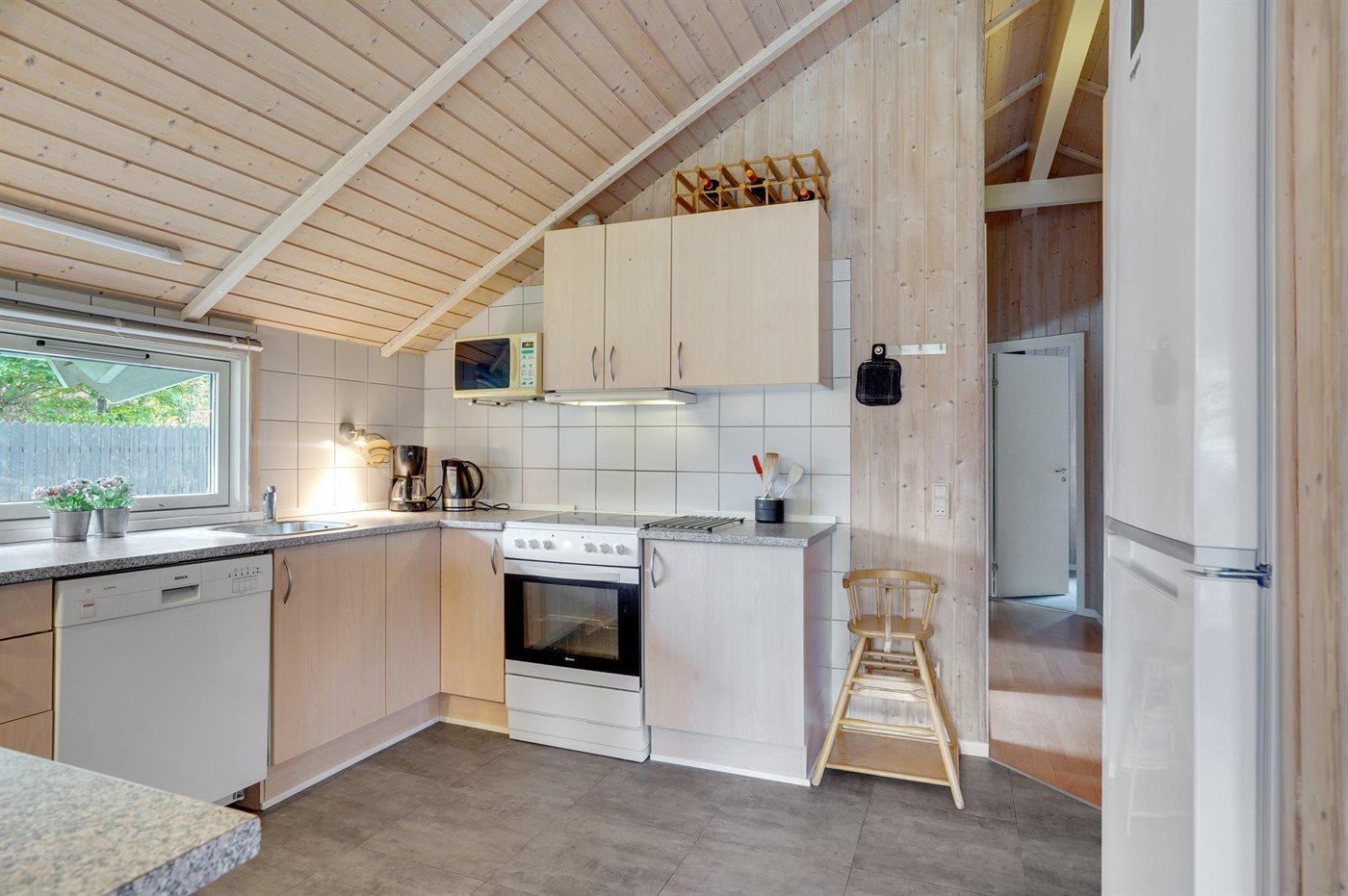 Køkkenet er udstyret med 1 køleskab. Der er 4 elkogeplader, bageovn, mikrobølgeovn samt opvaskemaskine.
