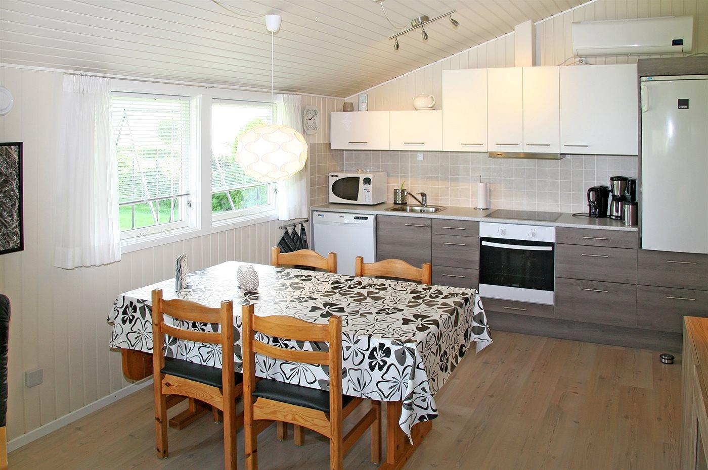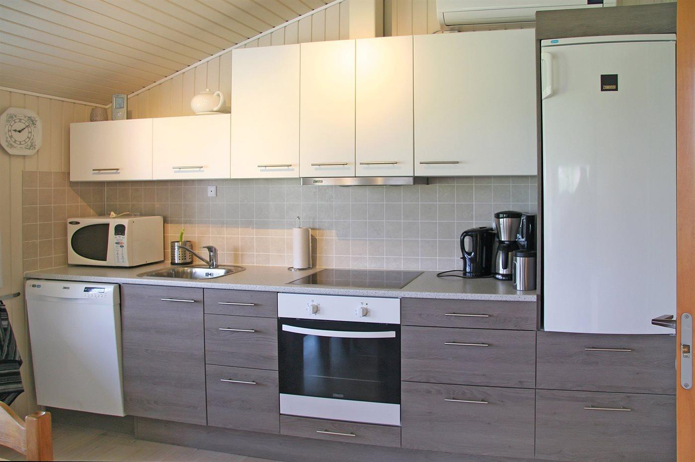 Køkkenet er udstyret med 1 køleskab. Der er 4 keramiske kogeplader, varmluftovn, mikrobølgeovn samt opvaskemaskine.