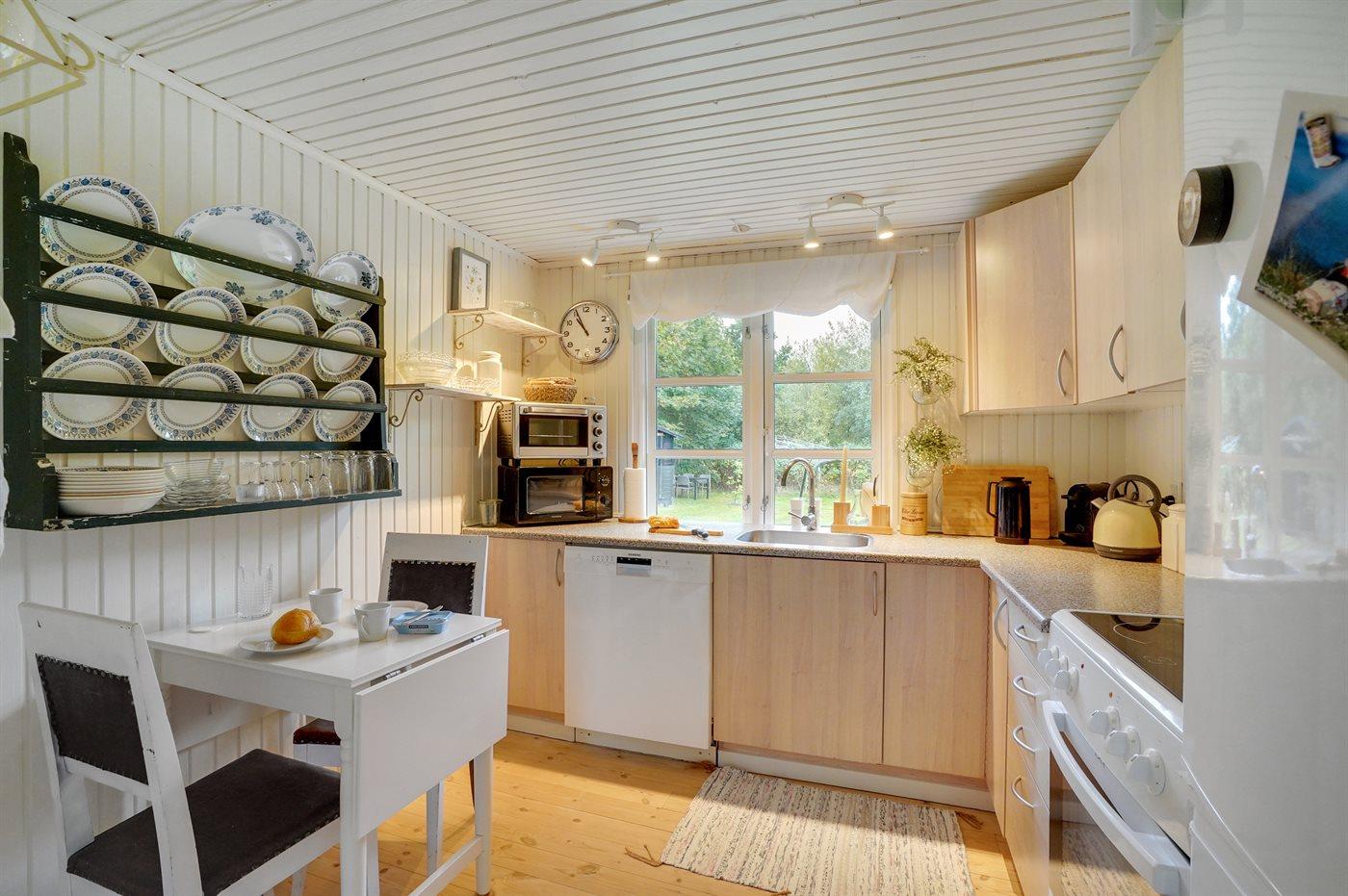 Køkkenet er udstyret med 1 køleskab. Der er 4 keramiske kogeplader, varmluftovn, mikrobølgeovn samt opvaskemaskine.