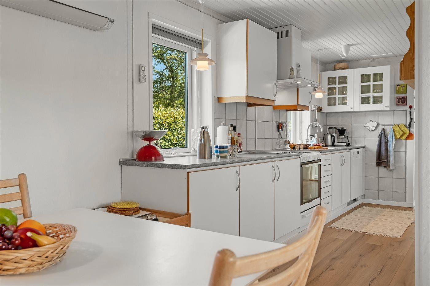 Køkkenet er udstyret med 1 køleskab. Der er 4 keramiske kogeplader, varmluftovn, mikrobølgeovn samt opvaskemaskine.