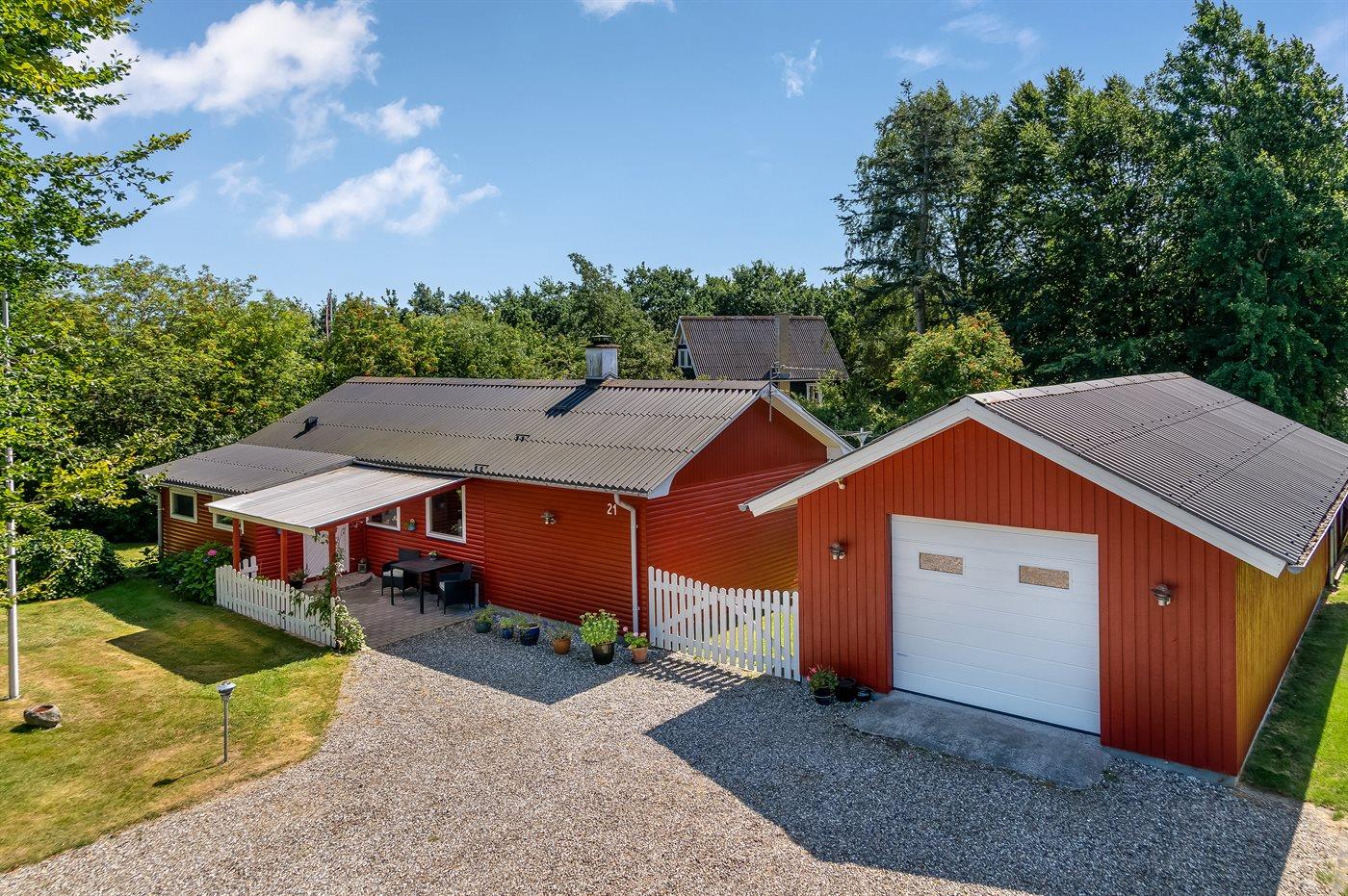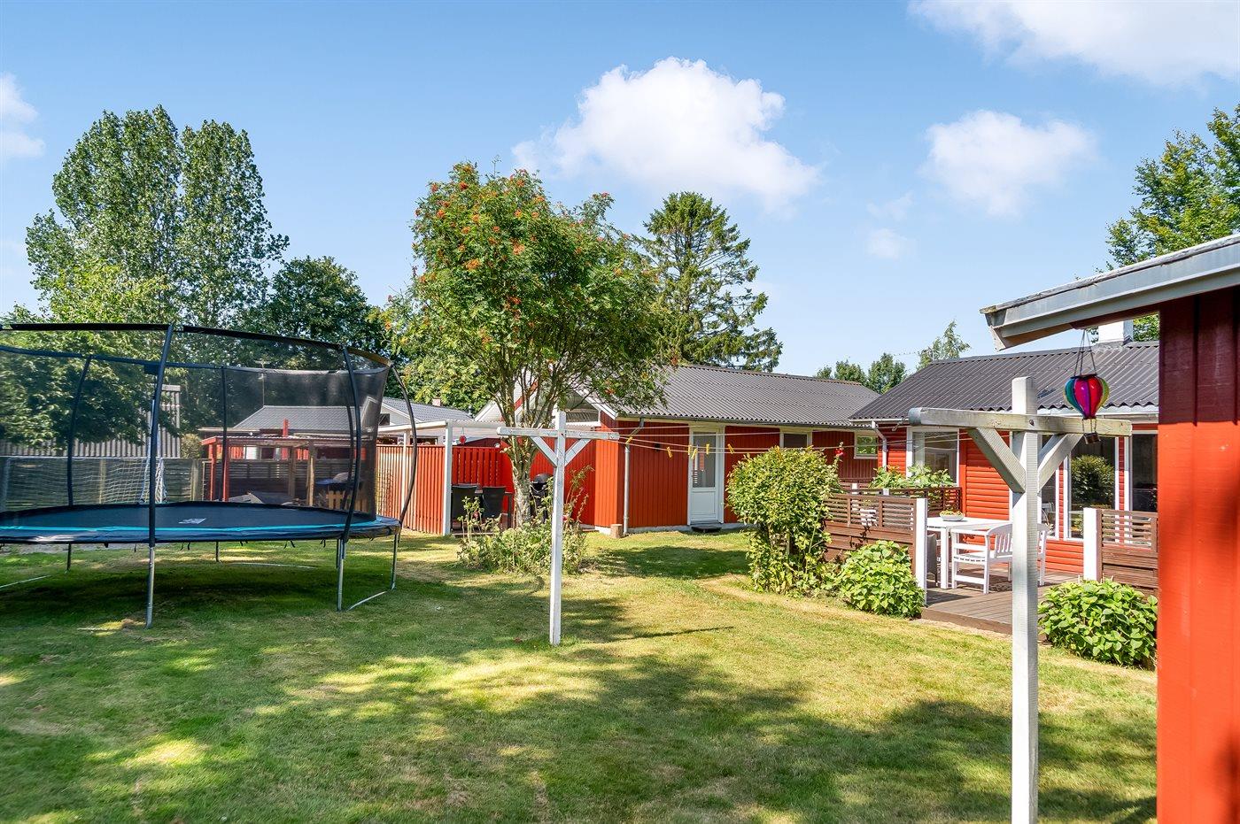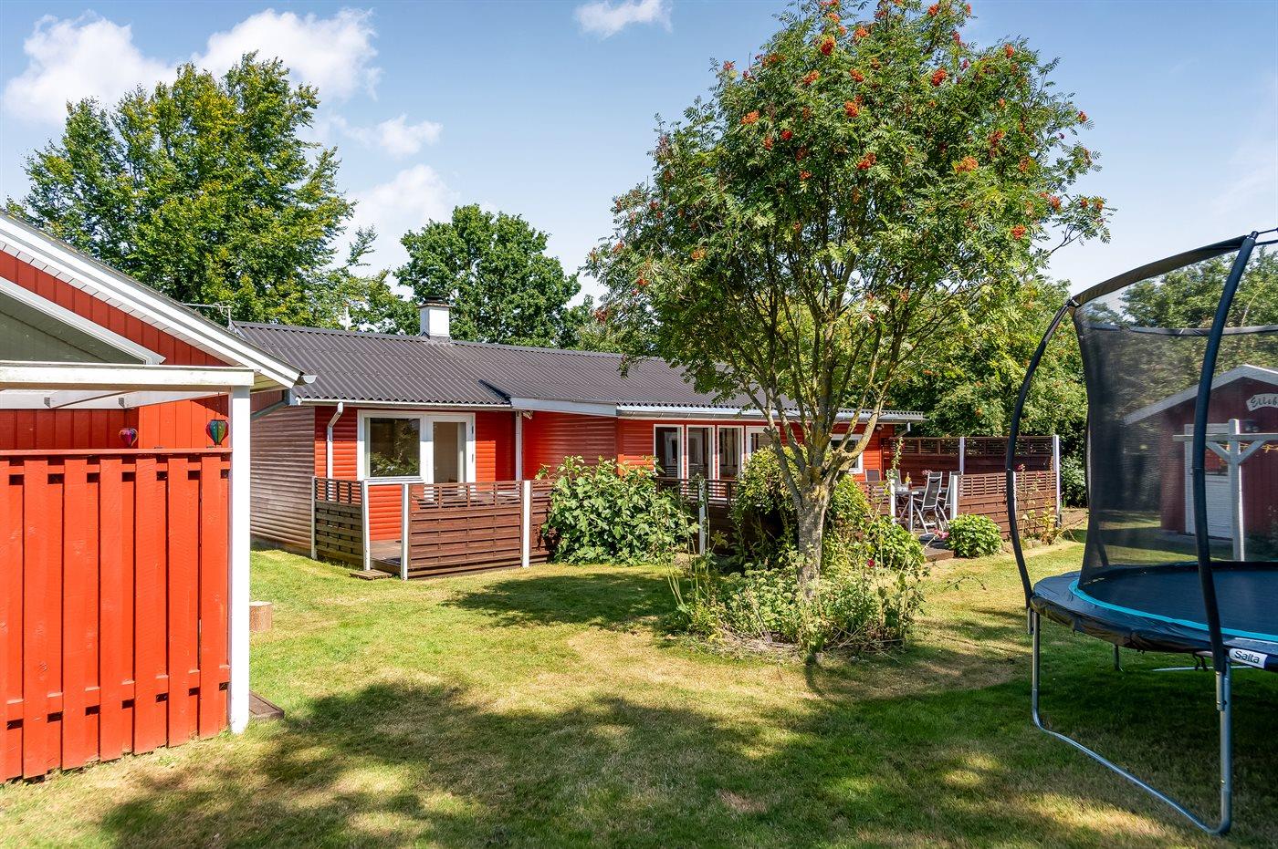 Ferieboligen er beliggende på en 1230 m² stor havegrund. Grunden er indhegnet. Der er 1300 m til havet. Der er 500 m til fjorden. Nærmeste forretning er beliggende i en afstand af 300 m. Der er en golfbane i en afstand af 3100 m. Til ferieboligen hører åbent terrasseareal. Desuden er der overdækket terrasse. Trampolin. Grill til rådighed. Parkering ved ferieboligen.