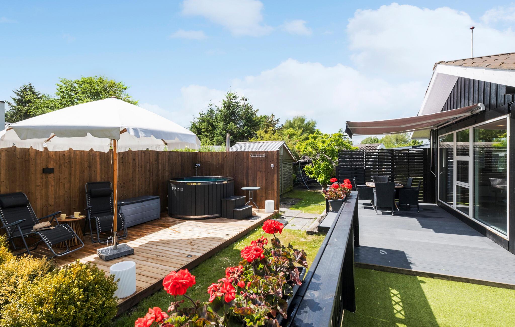 Det velholdte udendørsområde lokker børnene til at nyde den friske luft med gode legemuligheder. Forkæl jer selv med nogle afslappende øjeblikke i spabadet, brug de behagelige liggestole til afslappende læsetid og nyd jeres tid sammen med en stemningsfuld grillmiddag under stjernerne.