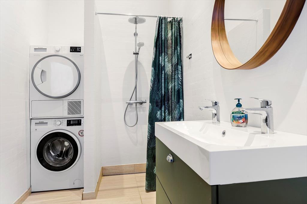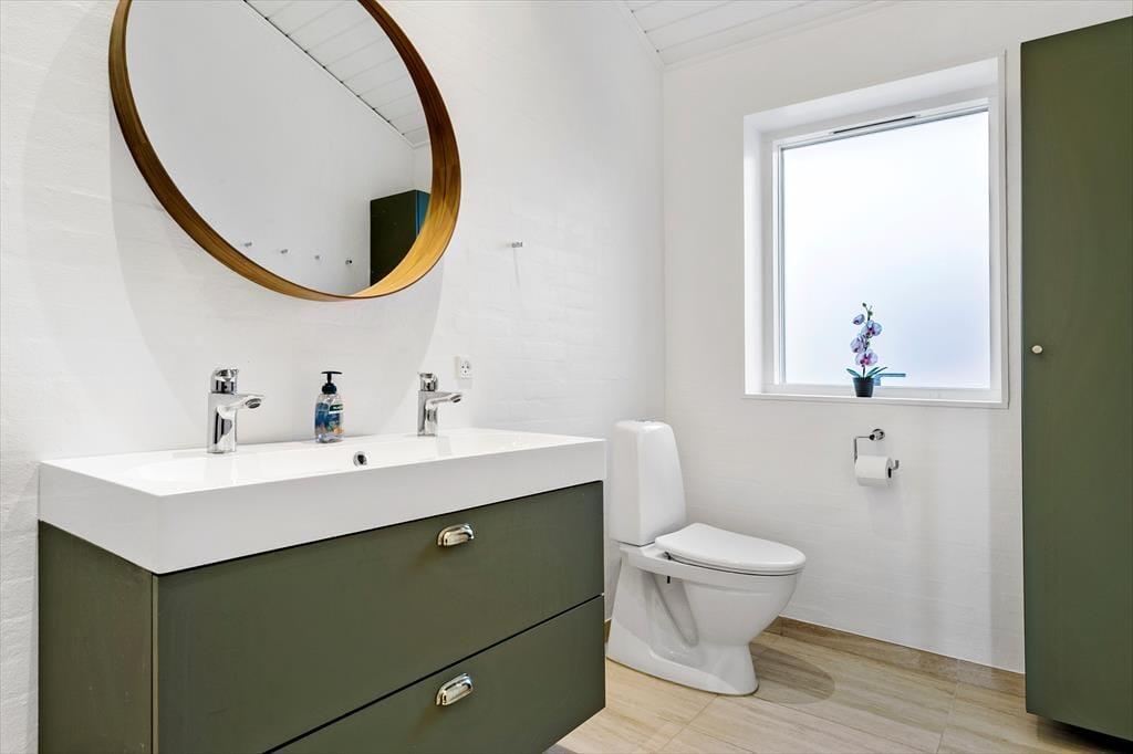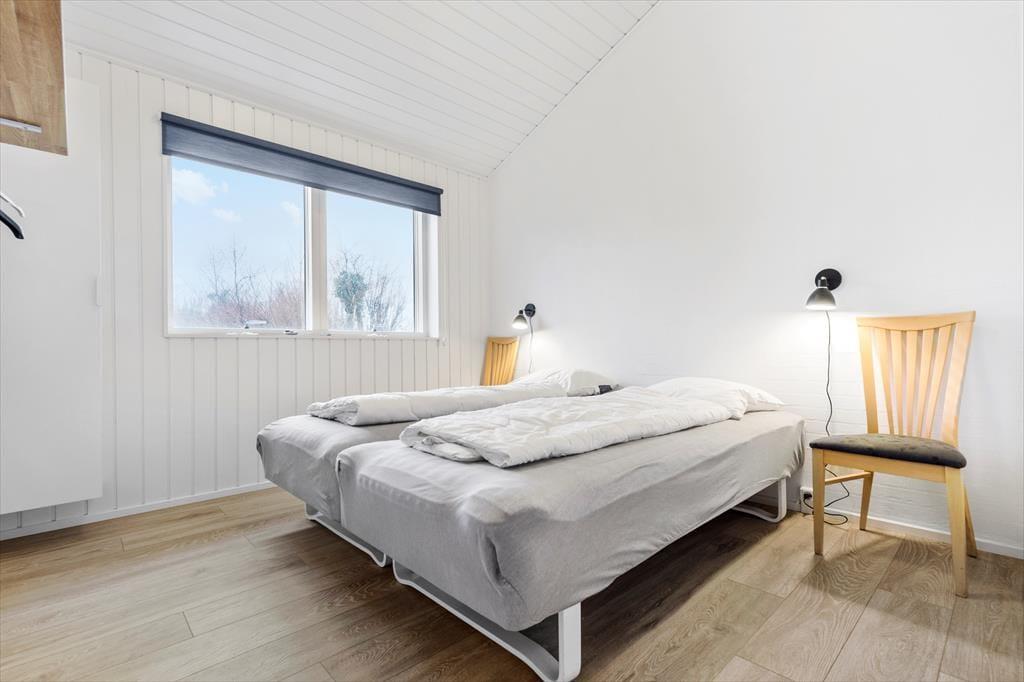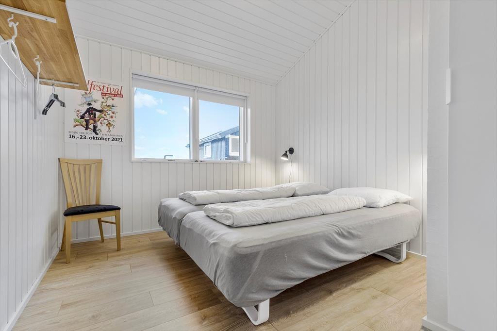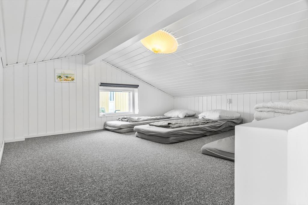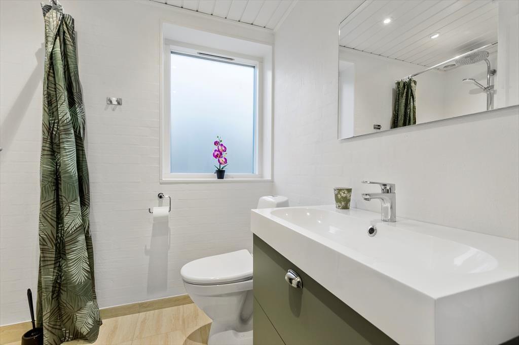 Med fire rummelige soveværelser er der plads til hele familien. Et værelse har en dobbeltseng, mens de tre øvrige har to enkeltsenge hver. Derudover er der en hyggelig hems, som er perfekt til børnene. Huset har to badeværelser med gulvvarme og brusenicher, så komforten er i top. Hele huset opvarmes med energieffektiv luft-til-vand gulvvarme. Den indhegnede grund giver mulighed for, at både små børn og hunde kan lege trygt i haven.