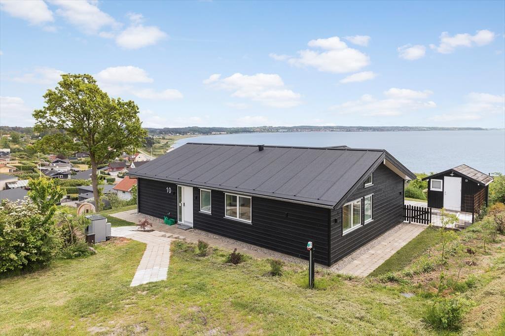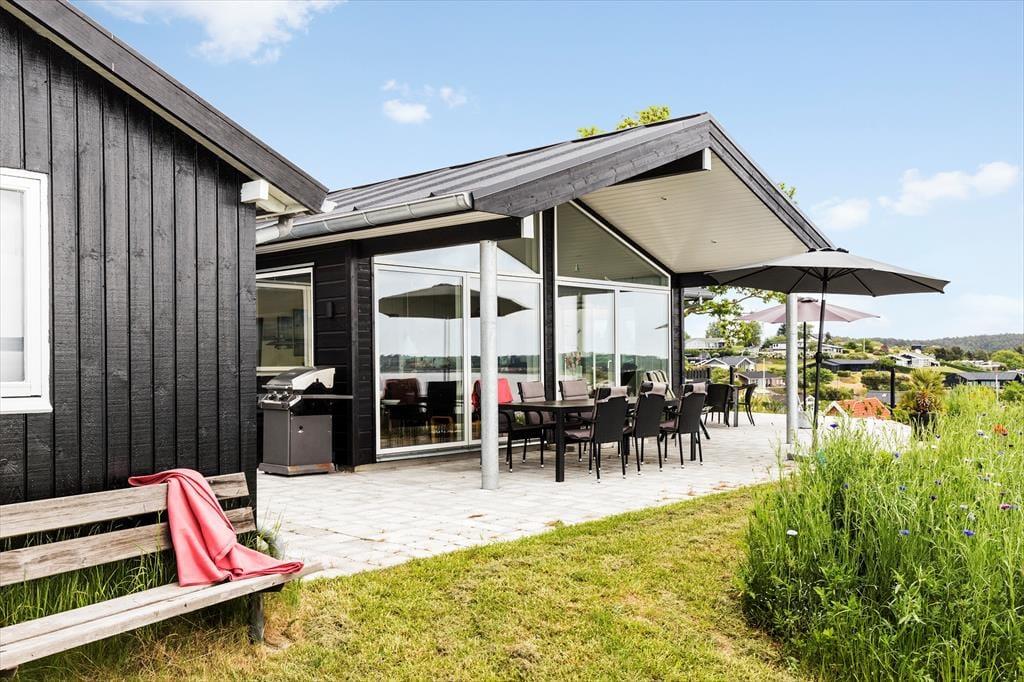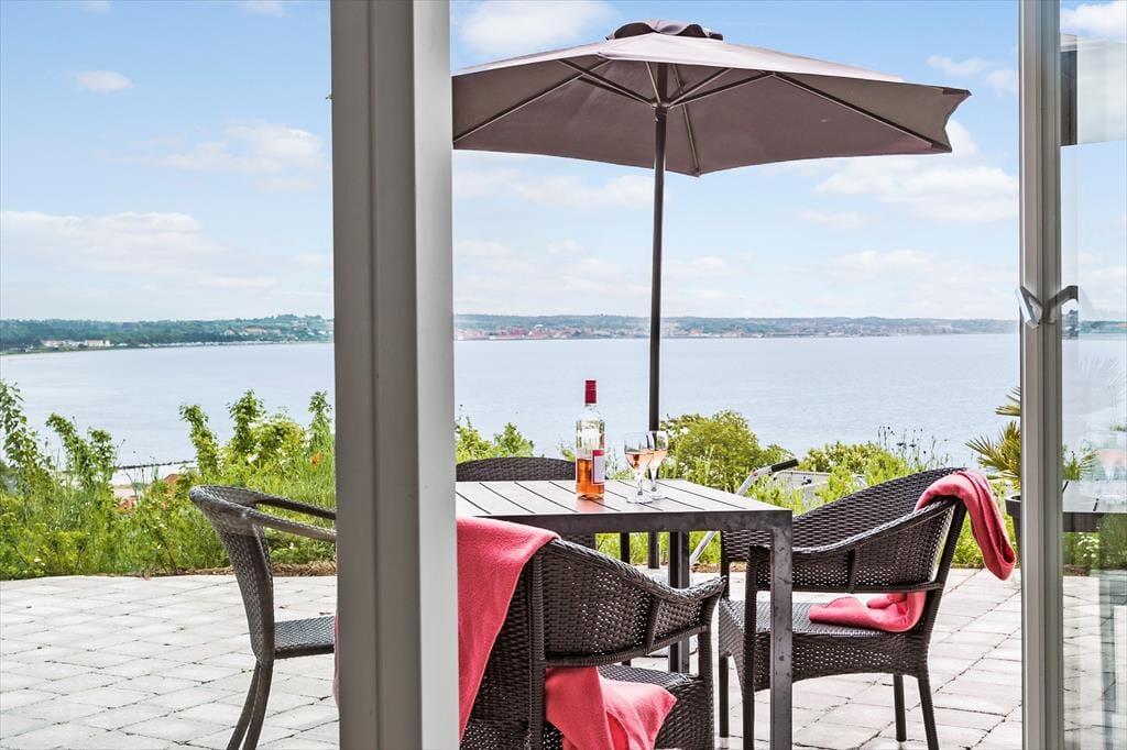 Feriehuset ligger på en højtbeliggende grund med en storslået udsigt over Ebeltoft Vig. Her kan I nyde rolige stunder på de dejlige terrassearealer, der er udstyret med havemøbler og grill. Terrassen inviterer til afslapning i solen og hyggelige aftener med kig til solnedgangen.