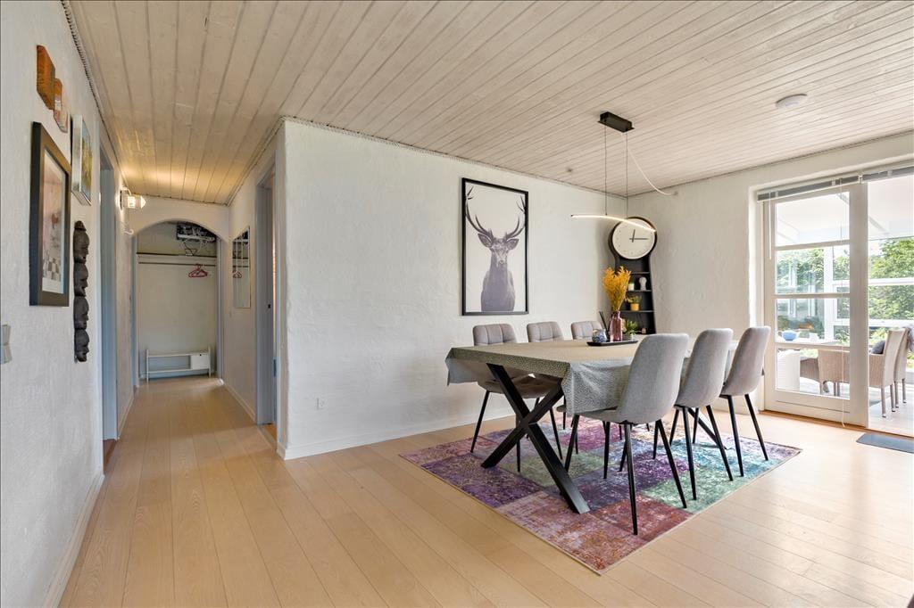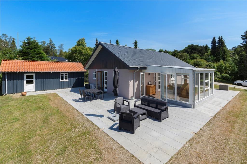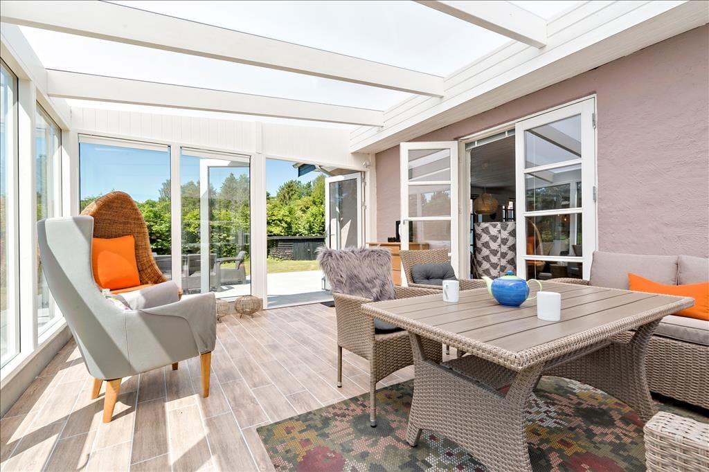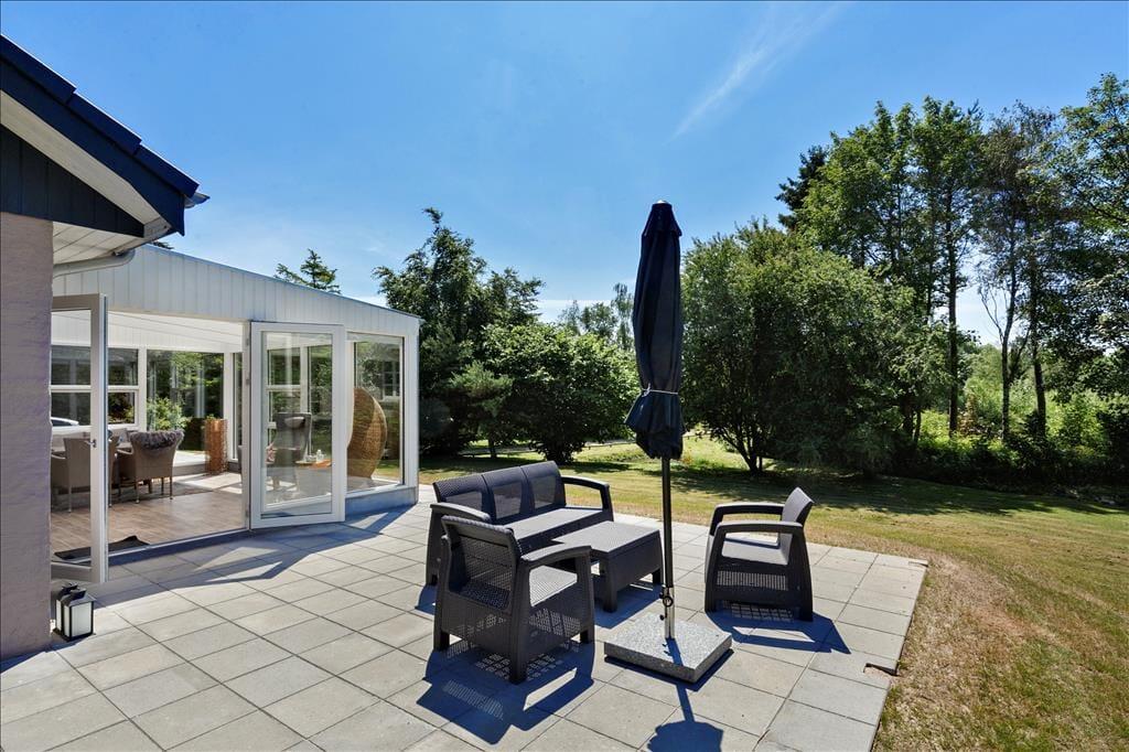 Du træder ud på den solrige terrasse, hvor du kan nyde morgenkaffen, grille om aftenen eller bare slappe af på liggestolen. Huset ligger på en dejlig naturgrund og er omgivet af stisystemer – ideelt til gåture og cykelture. Og når du trænger til det, ligger Egsmark Strand tæt på – klar til en frisk dukkert og bløde sandstrande.