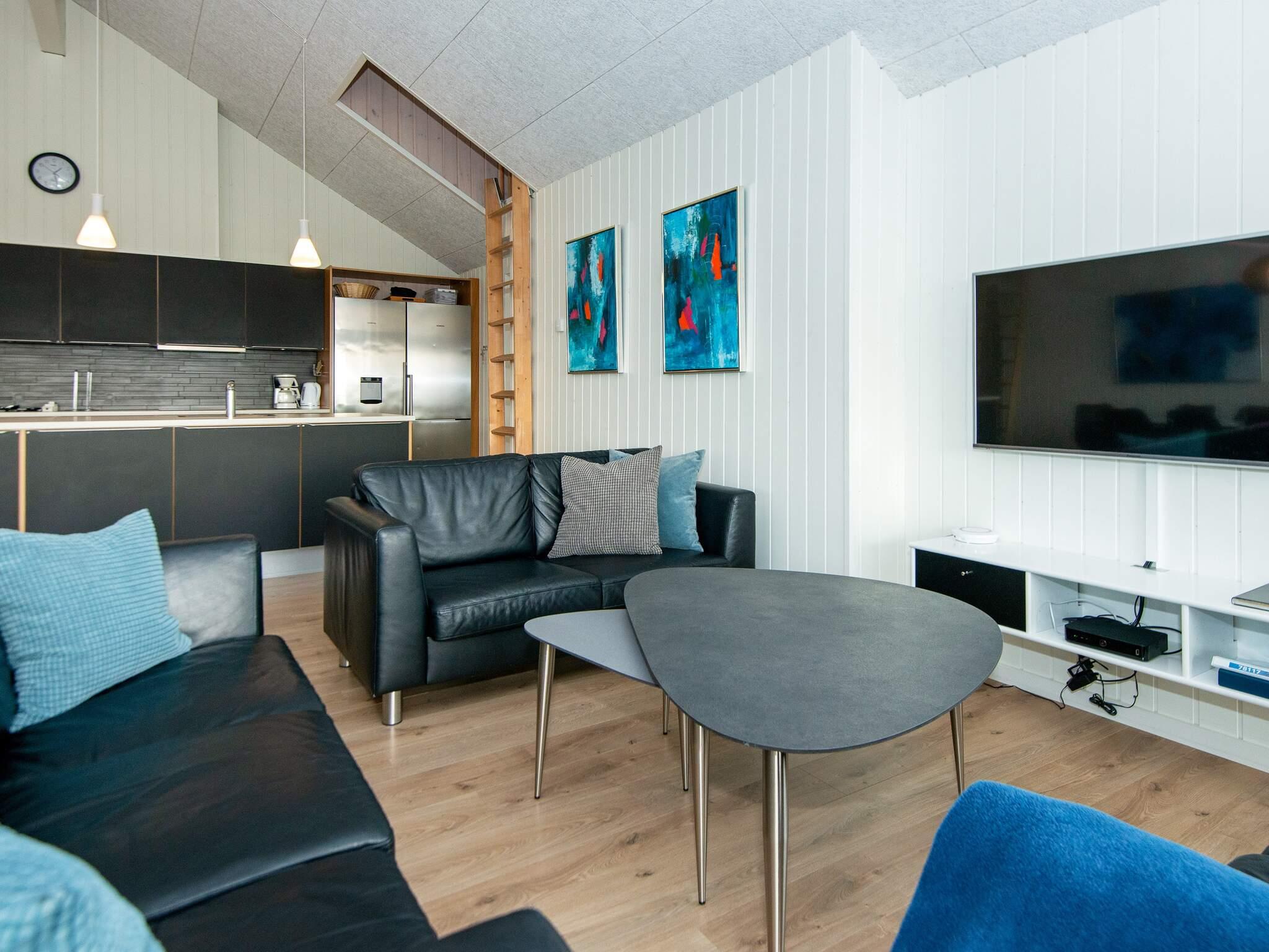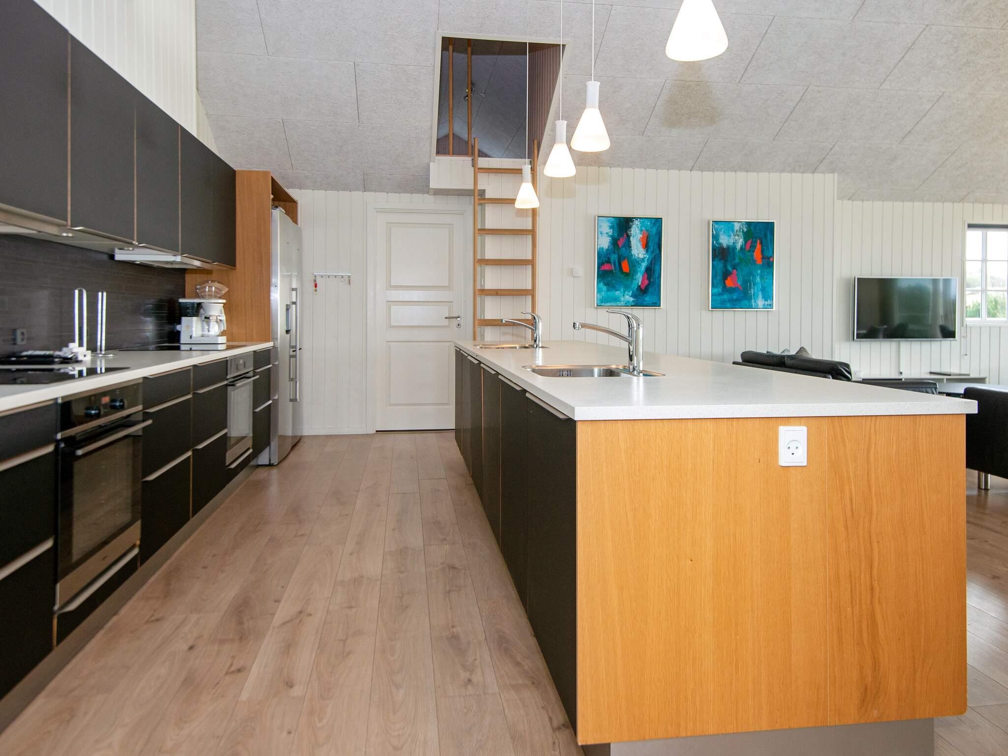 Sommerhuset er bygget i 2 etager og er fyldt med aktiviteter for store og små. I stueplan finder I det store køkkenalrum/opholdsrum, hvor alle gæster kan hygge sig samlet. Brændeovnen befinder sig i den ene ende af rummet og kan lune på kolde dage. Det stilfulde køkken er veludstyret og har både to opvaskemaskiner, to håndvaske, to komfurer og god køle/fryseplads.