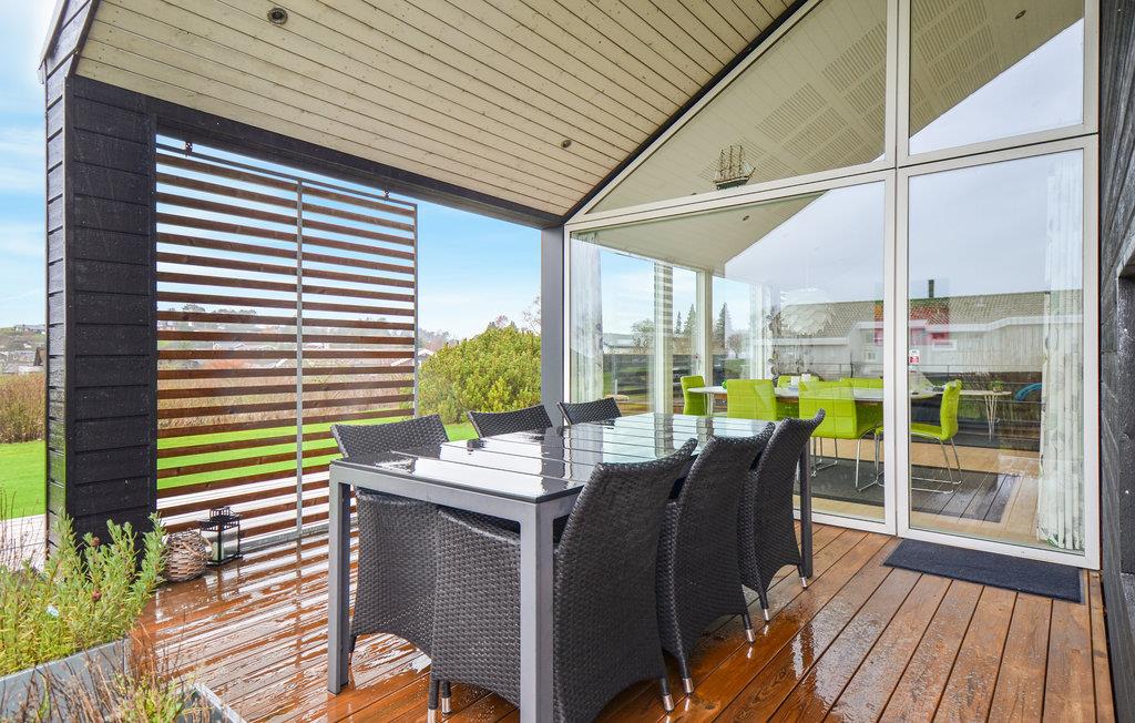 I forbindelse med husets store terrasseområde findes en overdækket terrasse, hvor aftenen kan nydes, selvom duggen falder.