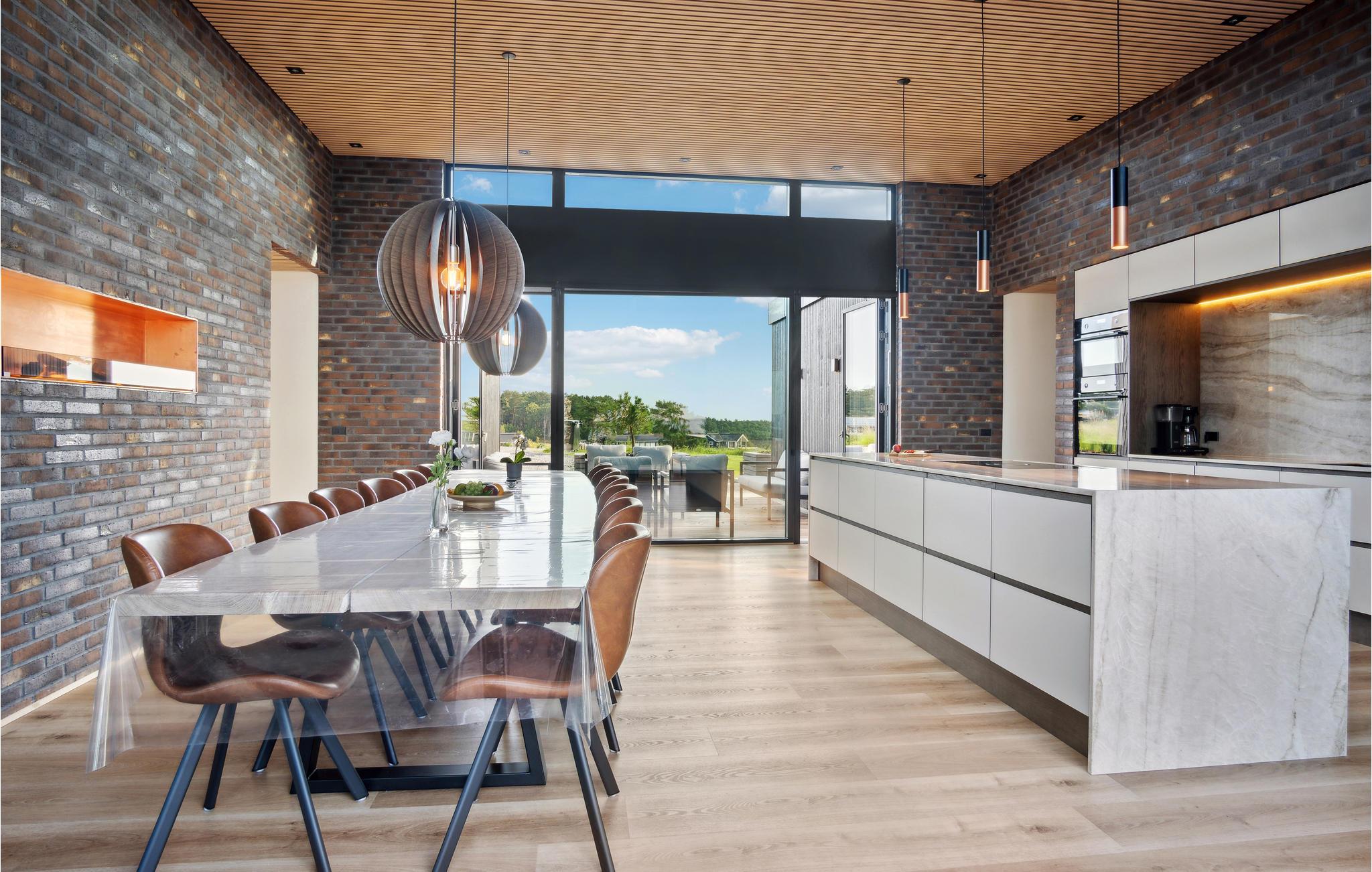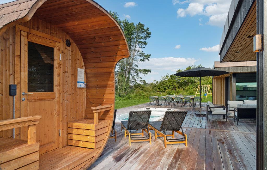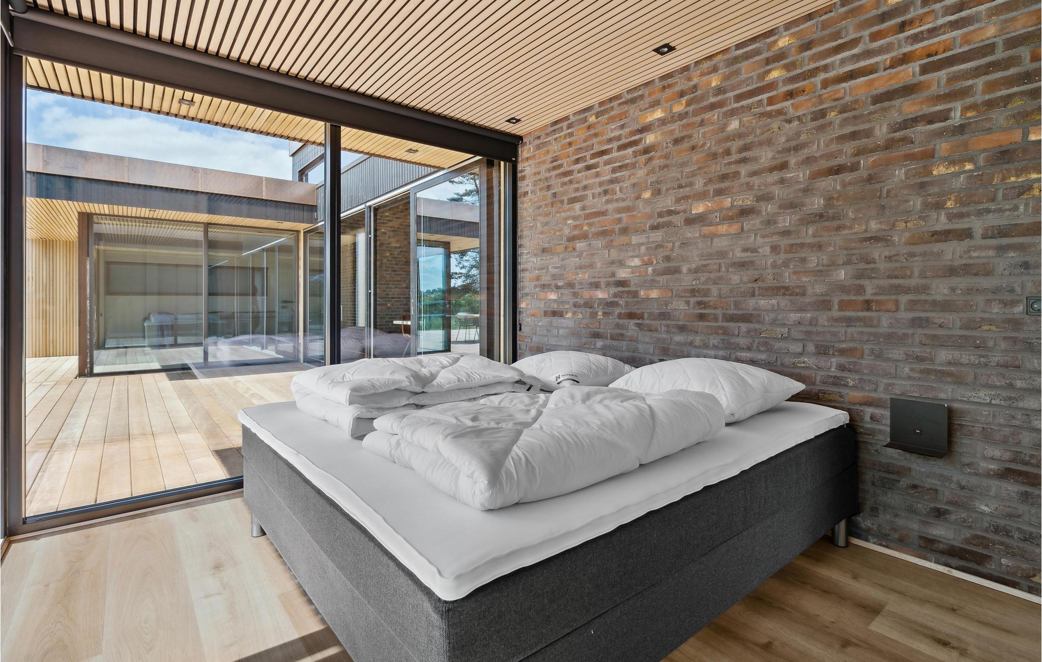 I denne arkitektoniske moderne perle harmonerer originalitet, nordisk æstetik og funktionalitet ned til mindste detalje. Huset fortryller med en yderst smagfuld forening af skandinavisk stil og moderne design, et højt niveau af komfort og en drømmeagtig beliggenhed med udsigt over havet. En ideel ferieoase til en fornøjelig familiesammenkomst! Se frem til fælles måltider ved det lange spisebord. Hvem mon dækker bord, og hvem laver mad i det strømlinede grebløse køkken? Efter en begivenhedsrig dag med mange aktiviteter venter en afslappende aften i de indbydende sofaer eller på terrassen, hvor I på varme dage også kan nyde alle jeres måltider. Nyd solen på den store terrasse og slap af i den skønne pool. Den mindre terrasse indbyder til aftenhygge eller kortspil med forfriskninger og snacks. Havet ligger i gåafstand fra huset.