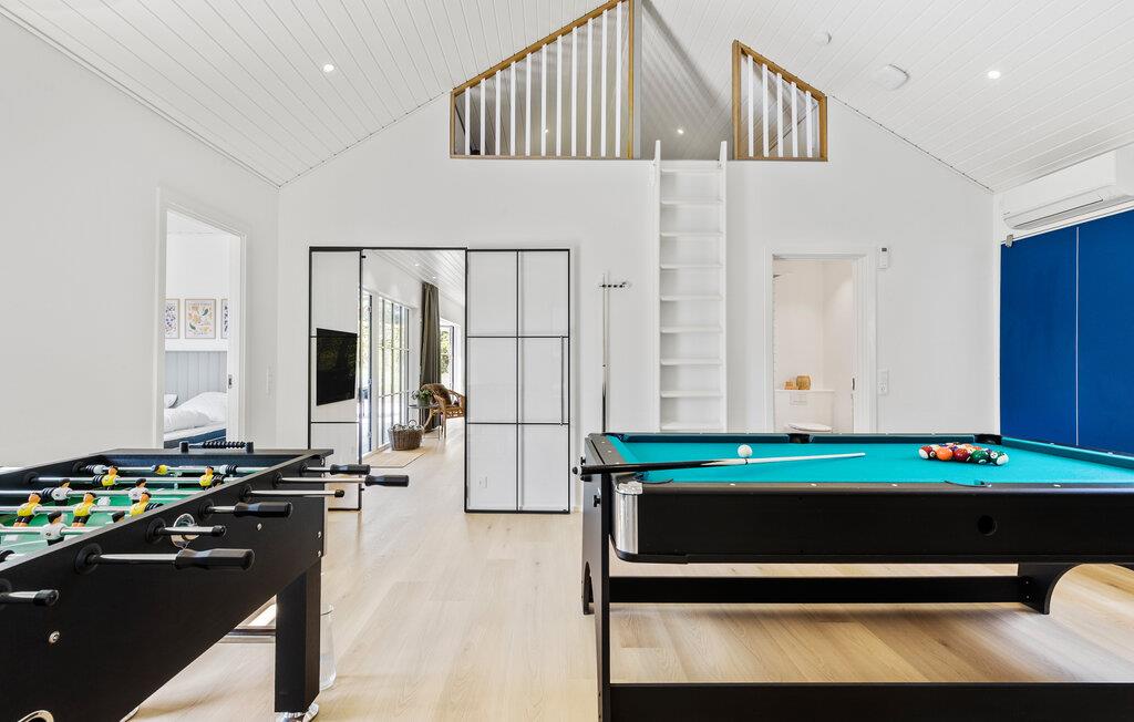 I dette stilfulde hus skaber de sprossede gulv til loft-vinduer, varme farver og elegante møbler en hyggelig atmosfære, hvor I kan slappe af og genoplade batterierne. Slap af med en film- eller spilleaften, spil et spil billard eller tryll et lækkert måltid frem til familie eller venner i det moderne køkken.