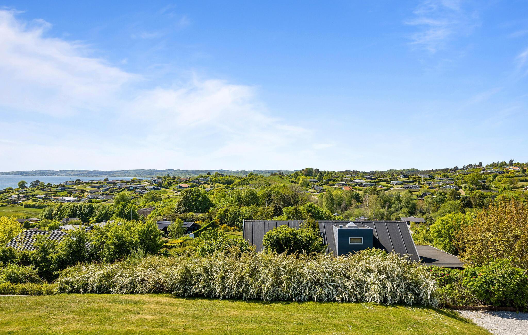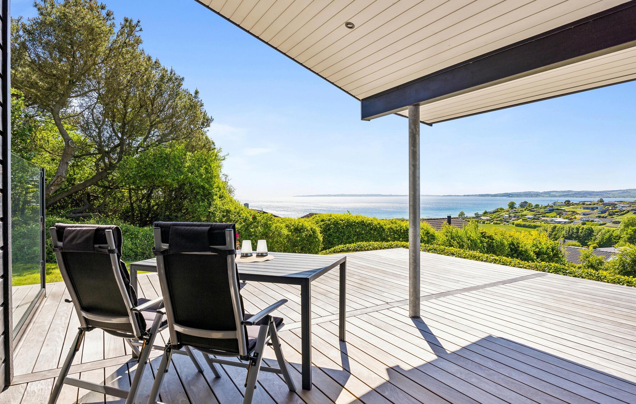 Stilfuldt feriehus med havudsigt, spabad og terrasse nær Egsmark Strand.