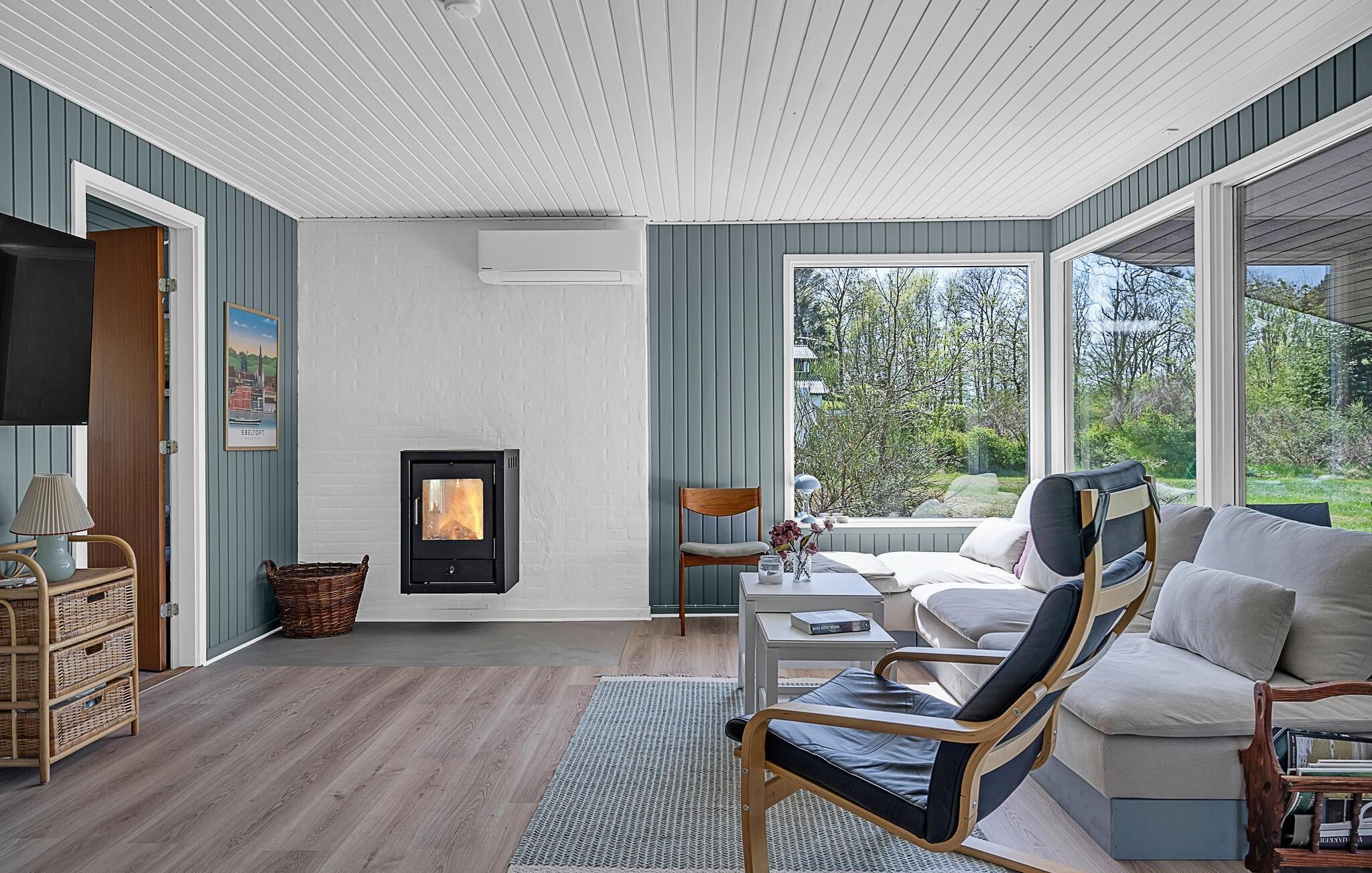 Dette charmerende feriehus giver jer den perfekte oase til en afslappende ferie. Nyd den hyggelige atmosfære i det velindrettede hus med masser af naturligt lys, rene linjer og en moderne skandinavisk stil. Den åbne opholdsstue lægger op til nyde en stille stund med et behageligt sofahjørne, brændeovn og stort vinduesudsigt til det grønne. Spis måltiderne ved det smukke spisebord og tilbered noget sammen i det moderne køkken.
