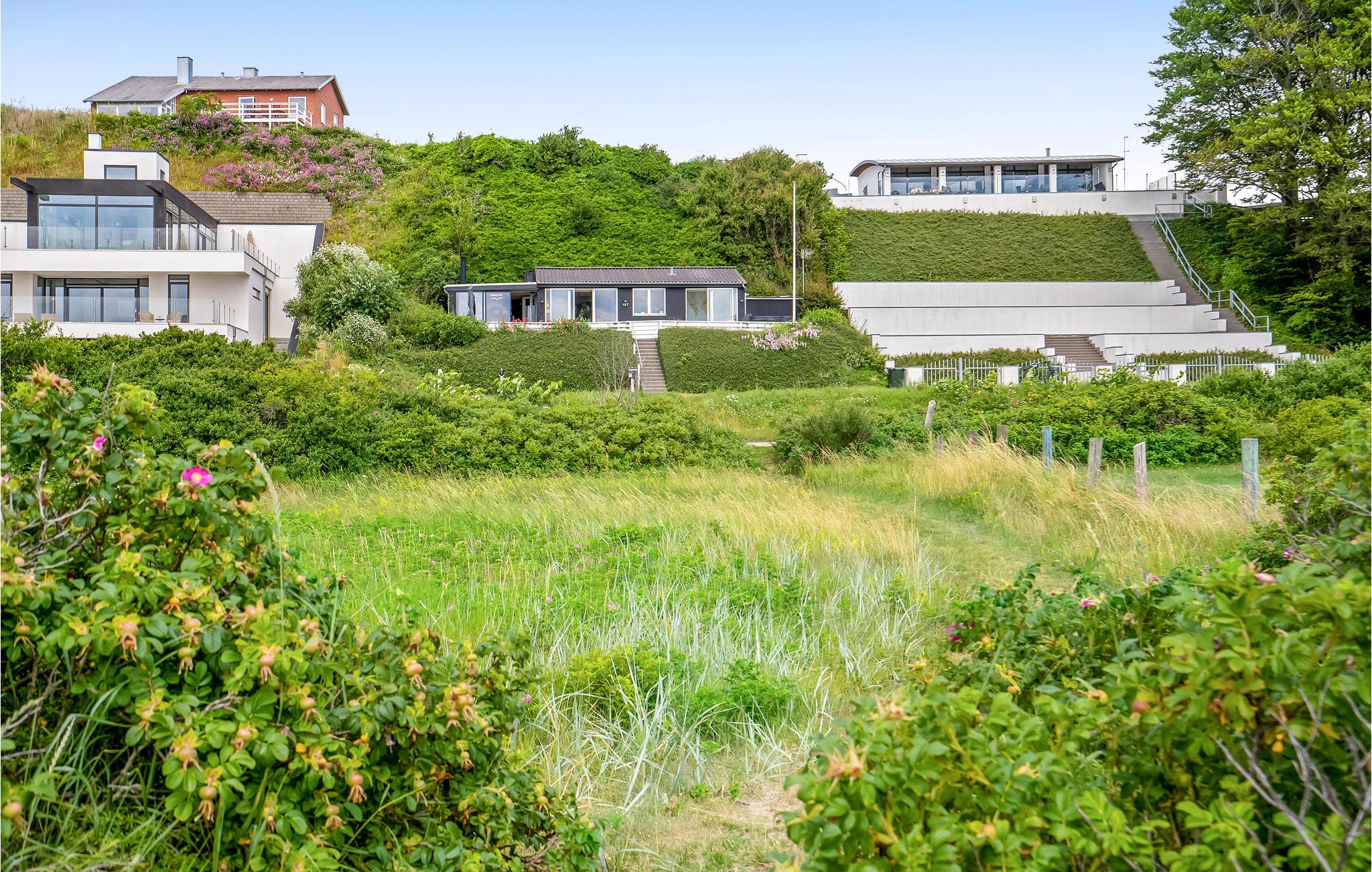 Feriehus ved Egsmark Strand med panoramaudsigt og stort udendørs spa tæt på stranden.